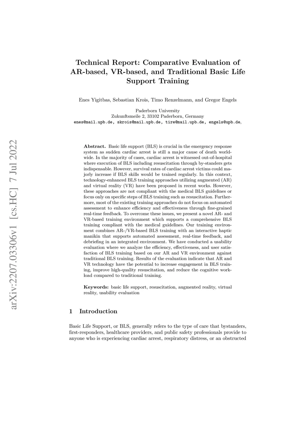 Basic life support (BLS) is crucial in the emergency response system as sudden cardiac arrest is still a major cause of death worldwide. In the majority of cases, cardiac arrest is witnessed out-of-hospital where execution of BLS including resuscitation through by-standers gets indispensable. However, survival rates of cardiac arrest victims could majorly increase if BLS skills would be trained regularly. In this context, technology-enhanced BLS training approaches utilizing augmented (AR) and virtual reality (VR) have been proposed in recent works. However, these approaches are not compliant with the medical BLS guidelines or focus only on specific steps of BLS training such as resuscitation. Furthermore, most of the existing training approaches do not focus on automated assessment to enhance efficiency and effectiveness through fine-grained real-time feedback. To overcome these issues, we present a novel AR- and VR-based training environment which supports a comprehensive BLS training compliant with the medical guidelines. Our training environment combines AR-/VR-based BLS training with an interactive haptic manikin that supports automated assessment, real-time feedback, and debriefing in an integrated environment. We have conducted a usability evaluation where we analyze the efficiency, effectiveness, and user satisfaction of BLS training based on our AR and VR environment against traditional BLS training. Results of the evaluation indicate that AR and VR technology have the potential to increase engagement in BLS training, improve high-quality resuscitation, and reduce the cognitive workload compared to traditional training.