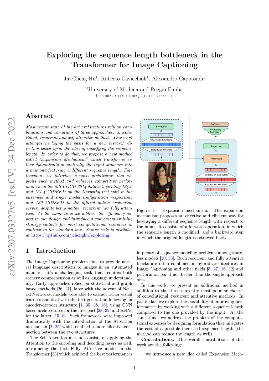 Most recent state of the art architectures rely on combinations and variations of three approaches: convolutional, recurrent and self-attentive methods. Our work attempts in laying the basis for a new research direction for sequence modeling based upon the idea of modifying the sequence length. In order to do that, we propose a new method called "Expansion Mechanism" which transforms either dynamically or statically the input sequence into a new one featuring a different sequence length. Furthermore, we introduce a novel architecture that exploits such method and achieves competitive performances on the MS-COCO 2014 data set, yielding 134.6 and 131.4 CIDEr-D on the Karpathy test split in the ensemble and single model configuration respectively and 130 CIDEr-D in the official online evaluation server, despite being neither recurrent nor fully attentive. At the same time we address the efficiency aspect in our design and introduce a convenient training strategy suitable for most computational resources in contrast to the standard one. Source code is available at https://github.com/jchenghu/exploring