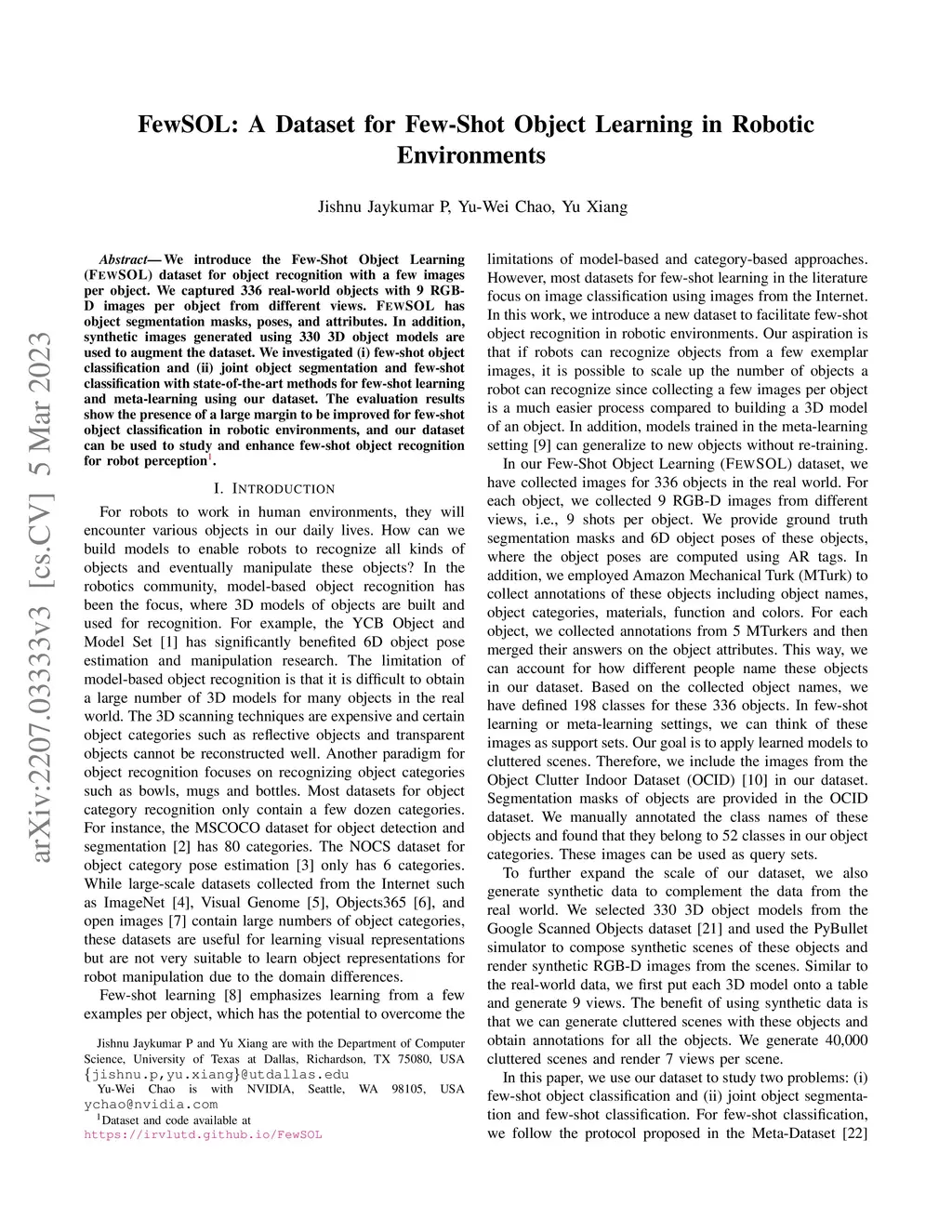 We introduce the Few-Shot Object Learning (FewSOL) dataset for object recognition with a few images per object. We captured 336 real-world objects with 9 RGB-D images per object from different views. Object segmentation masks, object poses and object attributes are provided. In addition, synthetic images generated using 330 3D object models are used to augment the dataset. We investigated (i) few-shot object classification and (ii) joint object segmentation and few-shot classification with the state-of-the-art methods for few-shot learning and meta-learning using our dataset. The evaluation results show that there is still a large margin to be improved for few-shot object classification in robotic environments. Our dataset can be used to study a set of few-shot object recognition problems such as classification, detection and segmentation, shape reconstruction, pose estimation, keypoint correspondences and attribute recognition. The dataset and code are available at https://irvlutd.github.io/FewSOL.