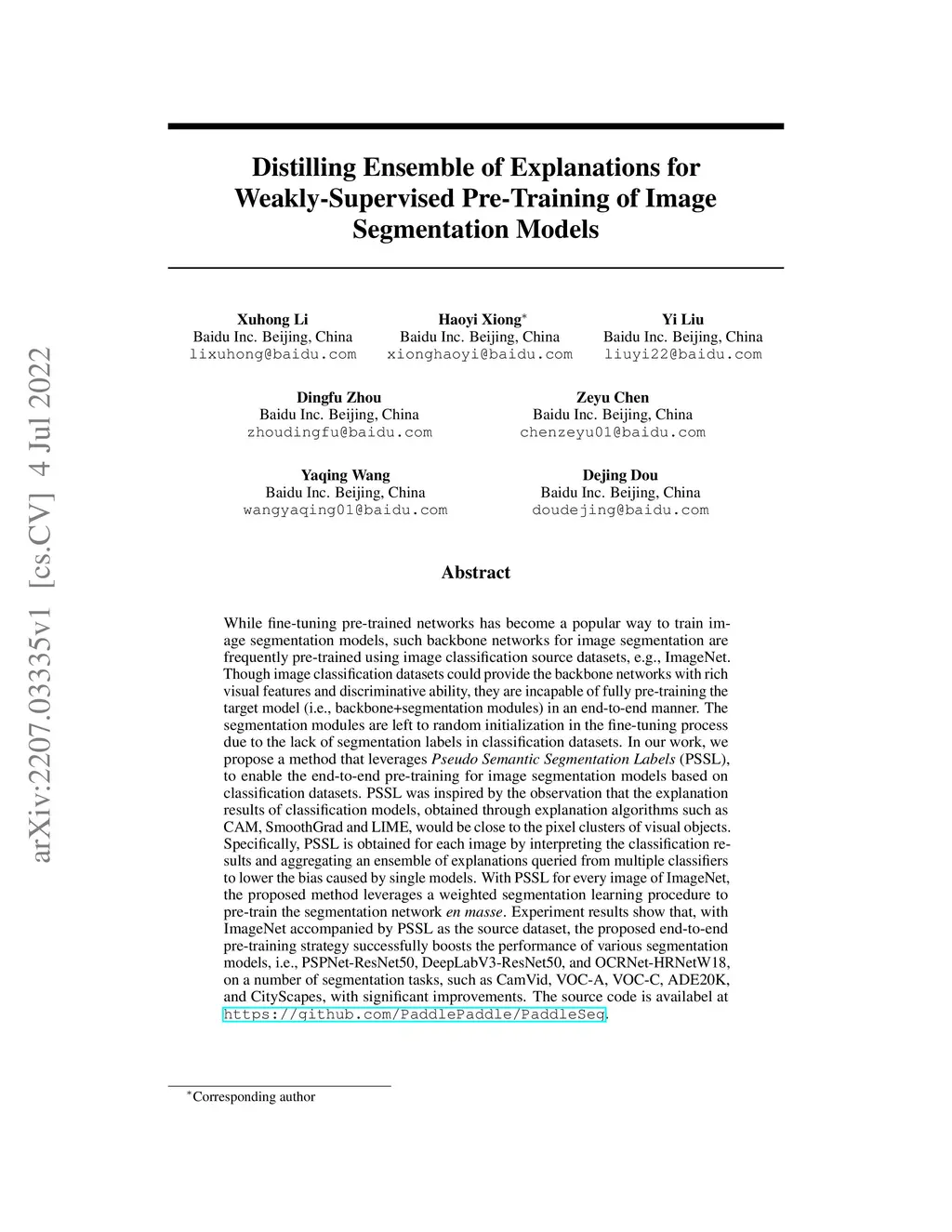 While fine-tuning pre-trained networks has become a popular way to train image segmentation models, such backbone networks for image segmentation are frequently pre-trained using image classification source datasets, e.g., ImageNet. Though image classification datasets could provide the backbone networks with rich visual features and discriminative ability, they are incapable of fully pre-training the target model (i.e., backbone+segmentation modules) in an end-to-end manner. The segmentation modules are left to random initialization in the fine-tuning process due to the lack of segmentation labels in classification datasets. In our work, we propose a method that leverages Pseudo Semantic Segmentation Labels (PSSL), to enable the end-to-end pre-training for image segmentation models based on classification datasets. PSSL was inspired by the observation that the explanation results of classification models, obtained through explanation algorithms such as CAM, SmoothGrad and LIME, would be close to the pixel clusters of visual objects. Specifically, PSSL is obtained for each image by interpreting the classification results and aggregating an ensemble of explanations queried from multiple classifiers to lower the bias caused by single models. With PSSL for every image of ImageNet, the proposed method leverages a weighted segmentation learning procedure to pre-train the segmentation network en masse. Experiment results show that, with ImageNet accompanied by PSSL as the source dataset, the proposed end-to-end pre-training strategy successfully boosts the performance of various segmentation models, i.e., PSPNet-ResNet50, DeepLabV3-ResNet50, and OCRNet-HRNetW18, on a number of segmentation tasks, such as CamVid, VOC-A, VOC-C, ADE20K, and CityScapes, with significant improvements. The source code is availabel at https://github.com/PaddlePaddle/PaddleSeg.