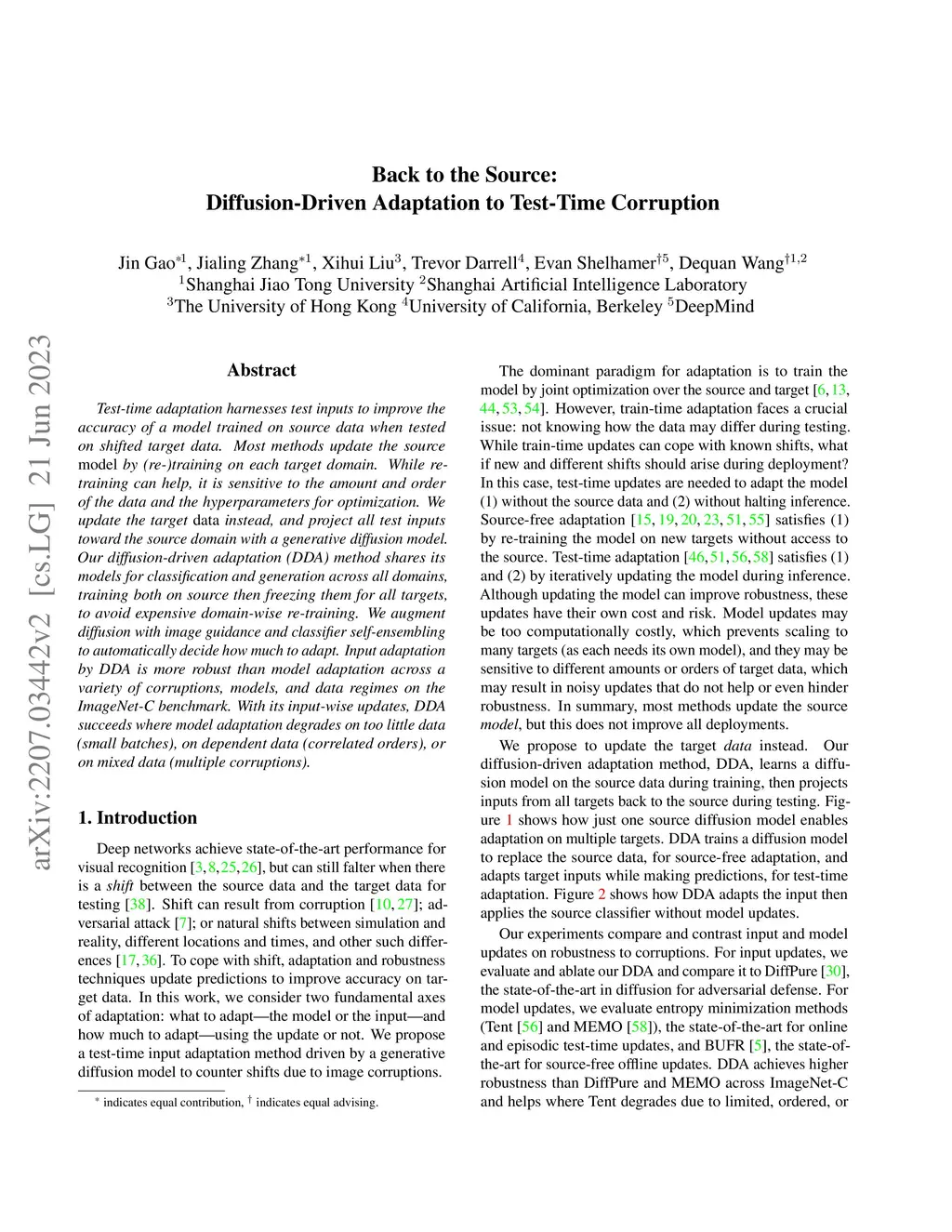 Test-time adaptation harnesses test inputs to improve the accuracy of a model trained on source data when tested on shifted target data. Existing methods update the source model by (re-)training on each target domain. While effective, re-training is sensitive to the amount and order of the data and the hyperparameters for optimization. We instead update the target data, by projecting all test inputs toward the source domain with a generative diffusion model. Our diffusion-driven adaptation method, DDA, shares its models for classification and generation across all domains. Both models are trained on the source domain, then fixed during testing. We augment diffusion with image guidance and self-ensembling to automatically decide how much to adapt. Input adaptation by DDA is more robust than prior model adaptation approaches across a variety of corruptions, architectures, and data regimes on the ImageNet-C benchmark. With its input-wise updates, DDA succeeds where model adaptation degrades on too little data in small batches, dependent data in non-uniform order, or mixed data with multiple corruptions.