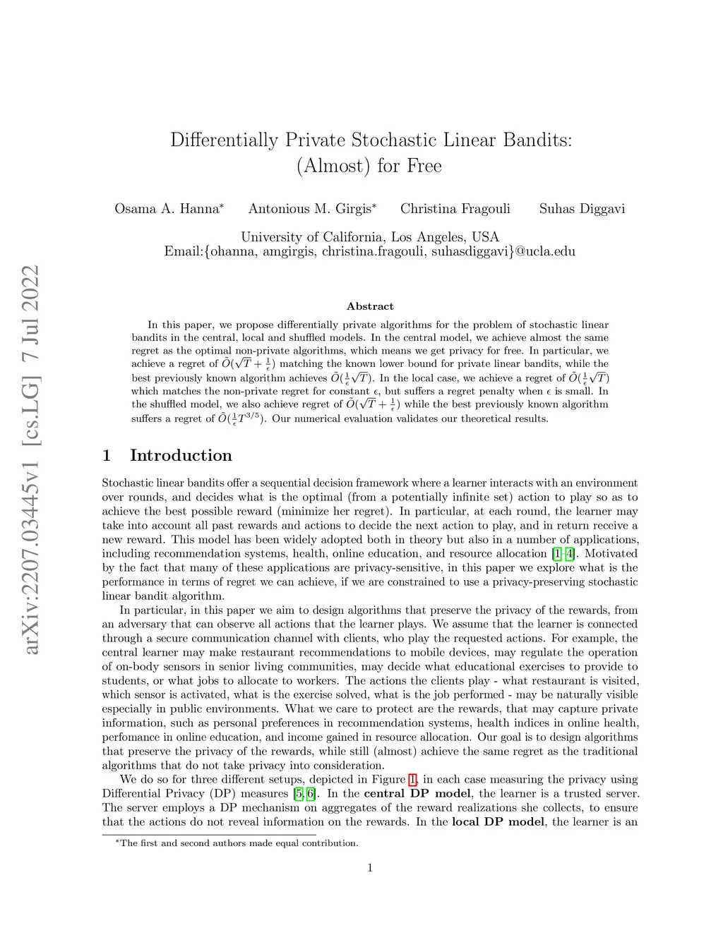 In this paper, we propose differentially private algorithms for the problem of stochastic linear bandits in the central, local and shuffled models. In the central model, we achieve almost the same regret as the optimal non-private algorithms, which means we get privacy for free. In particular, we achieve a regret of matching the known lower bound for private linear bandits, while the best previously known algorithm achieves . In the local case, we achieve a regret of which matches the non-private regret for constant , but suffers a regret penalty when is small. In the shuffled model, we also achieve regret of %for small as in the central case, while the best previously known algorithm suffers a regret of . Our numerical evaluation validates our theoretical results.
