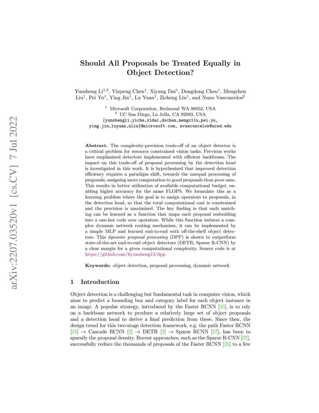 The complexity-precision trade-off of an object detector is a critical problem for resource constrained vision tasks. Previous works have emphasized detectors implemented with efficient backbones. The impact on this trade-off of proposal processing by the detection head is investigated in this work. It is hypothesized that improved detection efficiency requires a paradigm shift, towards the unequal processing of proposals, assigning more computation to good proposals than poor ones. This results in better utilization of available computational budget, enabling higher accuracy for the same FLOPS. We formulate this as a learning problem where the goal is to assign operators to proposals, in the detection head, so that the total computational cost is constrained and the precision is maximized. The key finding is that such matching can be learned as a function that maps each proposal embedding into a one-hot code over operators. While this function induces a complex dynamic network routing mechanism, it can be implemented by a simple MLP and learned end-to-end with off-the-shelf object detectors. This 'dynamic proposal processing' (DPP) is shown to outperform state-of-the-art end-to-end object detectors (DETR, Sparse R-CNN) by a clear margin for a given computational complexity.