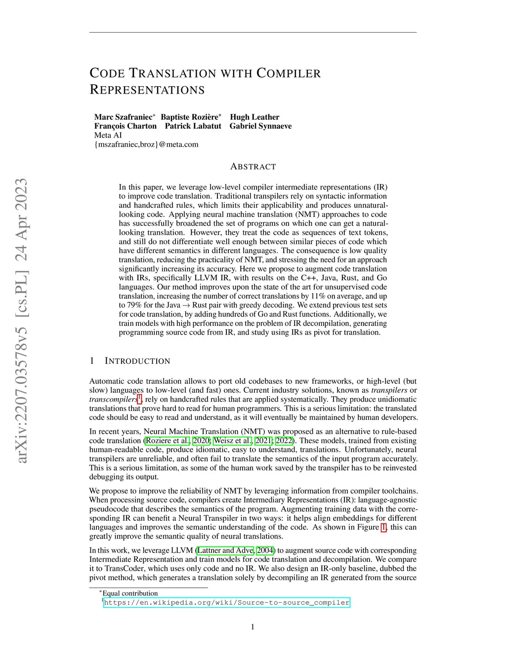 In this paper, we leverage low-level compiler intermediate representations (IR) to improve code translation. Traditional transpilers rely on syntactic information and handcrafted rules, which limits their applicability and produces unnatural-looking code. Applying neural machine translation (NMT) approaches to code has successfully broadened the set of programs on which one can get a natural-looking translation. However, they treat the code as sequences of text tokens, and still do not differentiate well enough between similar pieces of code which have different semantics in different languages. The consequence is low quality translation, reducing the practicality of NMT, and stressing the need for an approach significantly increasing its accuracy. Here we propose to augment code translation with IRs, specifically LLVM IR, with results on the C++, Java, Rust, and Go languages. Our method improves upon the state of the art for unsupervised code translation, increasing the number of correct translations by 11% on average, and up to 79% for the Java -> Rust pair with greedy decoding. We extend previous test sets for code translation, by adding hundreds of Go and Rust functions. Additionally, we train models with high performance on the problem of IR decompilation, generating programming source code from IR, and study using IRs as intermediary pivot for translation.
