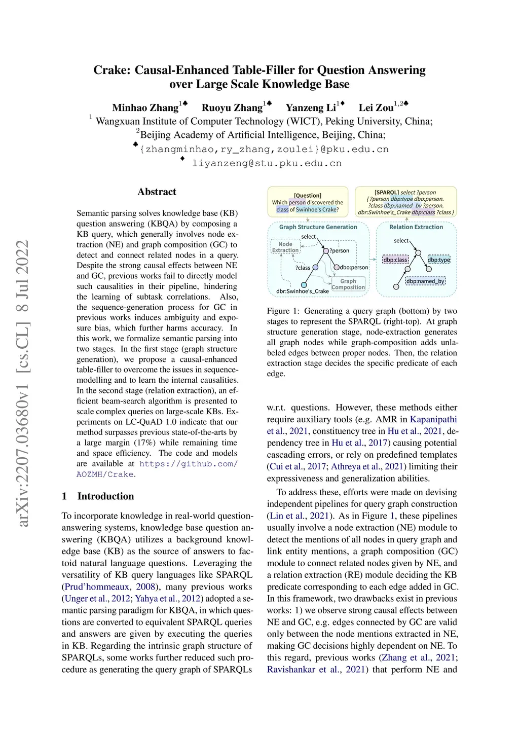 Semantic parsing solves knowledge base (KB) question answering (KBQA) by composing a KB query, which generally involves node extraction (NE) and graph composition (GC) to detect and connect related nodes in a query. Despite the strong causal effects between NE and GC, previous works fail to directly model such causalities in their pipeline, hindering the learning of subtask correlations. Also, the sequence-generation process for GC in previous works induces ambiguity and exposure bias, which further harms accuracy. In this work, we formalize semantic parsing into two stages. In the first stage (graph structure generation), we propose a causal-enhanced table-filler to overcome the issues in sequence-modelling and to learn the internal causalities. In the second stage (relation extraction), an efficient beam-search algorithm is presented to scale complex queries on large-scale KBs. Experiments on LC-QuAD 1.0 indicate that our method surpasses previous state-of-the-arts by a large margin (17%) while remaining time and space efficiency. The code and models are available at https://github.com/AOZMH/Crake.