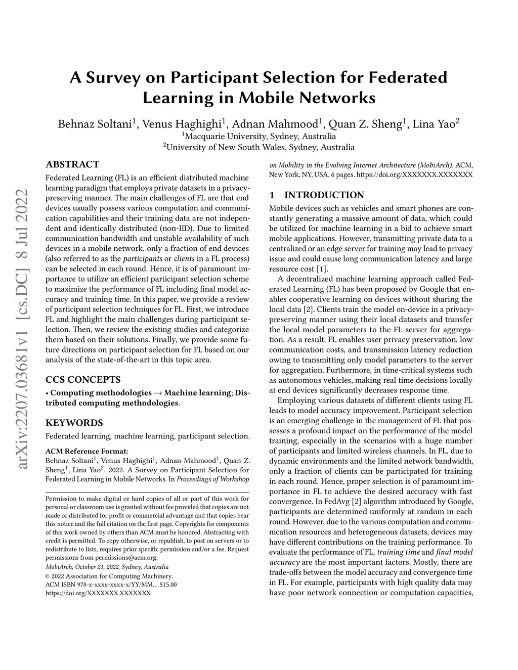 Federated Learning (FL) is an efficient distributed machine learning paradigm that employs private datasets in a privacy-preserving manner. The main challenges of FL is that end devices usually possess various computation and communication capabilities and their training data are not independent and identically distributed (non-IID). Due to limited communication bandwidth and unstable availability of such devices in a mobile network, only a fraction of end devices (also referred to as the participants or clients in a FL process) can be selected in each round. Hence, it is of paramount importance to utilize an efficient participant selection scheme to maximize the performance of FL including final model accuracy and training time. In this paper, we provide a review of participant selection techniques for FL. First, we introduce FL and highlight the main challenges during participant selection. Then, we review the existing studies and categorize them based on their solutions. Finally, we provide some future directions on participant selection for FL based on our analysis of the state-of-the-art in this topic area.