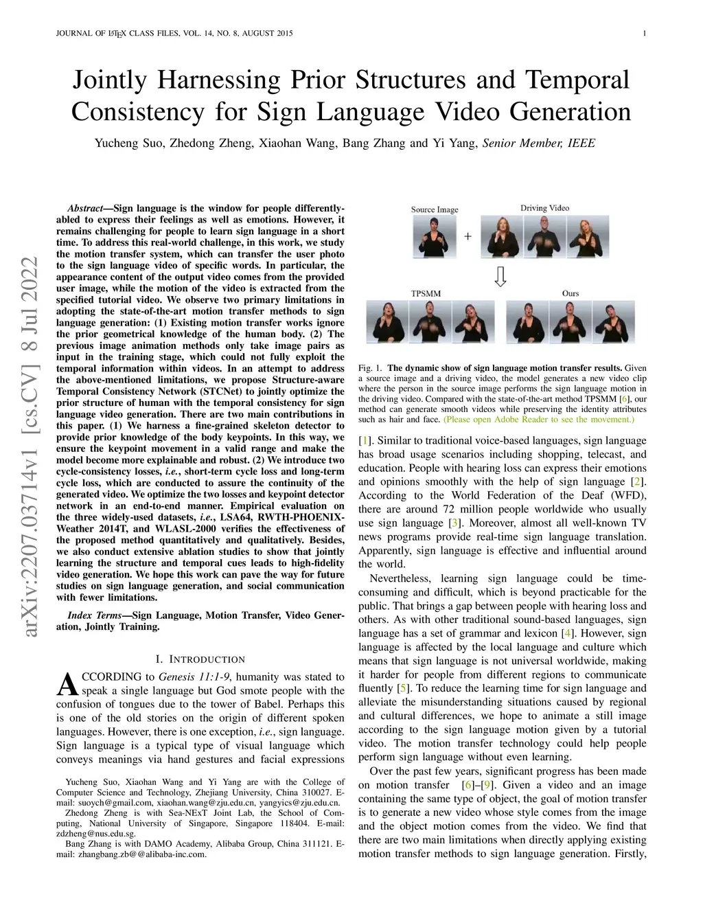 Sign language is the window for people differently-abled to express their feelings as well as emotions. However, it remains challenging for people to learn sign language in a short time. To address this real-world challenge, in this work, we study the motion transfer system, which can transfer the user photo to the sign language video of specific words. In particular, the appearance content of the output video comes from the provided user image, while the motion of the video is extracted from the specified tutorial video. We observe two primary limitations in adopting the state-of-the-art motion transfer methods to sign language generation:(1) Existing motion transfer works ignore the prior geometrical knowledge of the human body. (2) The previous image animation methods only take image pairs as input in the training stage, which could not fully exploit the temporal information within videos. In an attempt to address the above-mentioned limitations, we propose Structure-aware Temporal Consistency Network (STCNet) to jointly optimize the prior structure of human with the temporal consistency for sign language video generation. There are two main contributions in this paper. (1) We harness a fine-grained skeleton detector to provide prior knowledge of the body keypoints. In this way, we ensure the keypoint movement in a valid range and make the model become more explainable and robust. (2) We introduce two cycle-consistency losses, i.e., short-term cycle loss and long-term cycle loss, which are conducted to assure the continuity of the generated video. We optimize the two losses and keypoint detector network in an end-to-end manner.