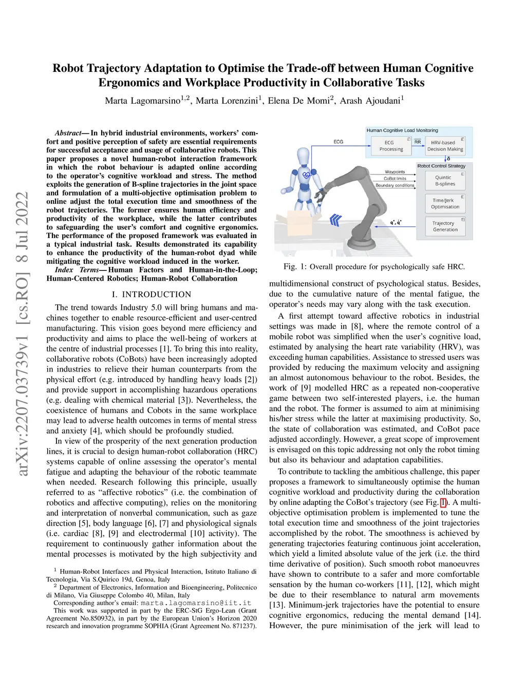 In hybrid industrial environments, workers' comfort and positive perception of safety are essential requirements for successful acceptance and usage of collaborative robots. This paper proposes a novel human-robot interaction framework in which the robot behaviour is adapted online according to the operator's cognitive workload and stress. The method exploits the generation of B-spline trajectories in the joint space and formulation of a multi-objective optimisation problem to online adjust the total execution time and smoothness of the robot trajectories. The former ensures human efficiency and productivity of the workplace, while the latter contributes to safeguarding the user's comfort and cognitive ergonomics. The performance of the proposed framework was evaluated in a typical industrial task. Results demonstrated its capability to enhance the productivity of the human-robot dyad while mitigating the cognitive workload induced in the worker.