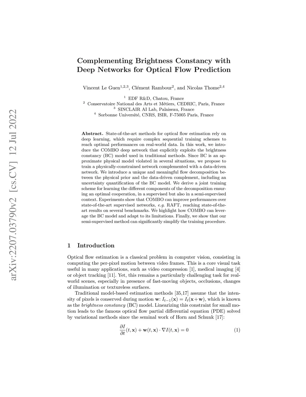 State-of-the-art methods for optical flow estimation rely on deep learning, which require complex sequential training schemes to reach optimal performances on real-world data. In this work, we introduce the COMBO deep network that explicitly exploits the brightness constancy (BC) model used in traditional methods. Since BC is an approximate physical model violated in several situations, we propose to train a physically-constrained network complemented with a data-driven network. We introduce a unique and meaningful flow decomposition between the physical prior and the data-driven complement, including an uncertainty quantification of the BC model. We derive a joint training scheme for learning the different components of the decomposition ensuring an optimal cooperation, in a supervised but also in a semi-supervised context. Experiments show that COMBO can improve performances over state-of-the-art supervised networks, e.g. RAFT, reaching state-of-the-art results on several benchmarks. We highlight how COMBO can leverage the BC model and adapt to its limitations. Finally, we show that our semi-supervised method can significantly simplify the training procedure.