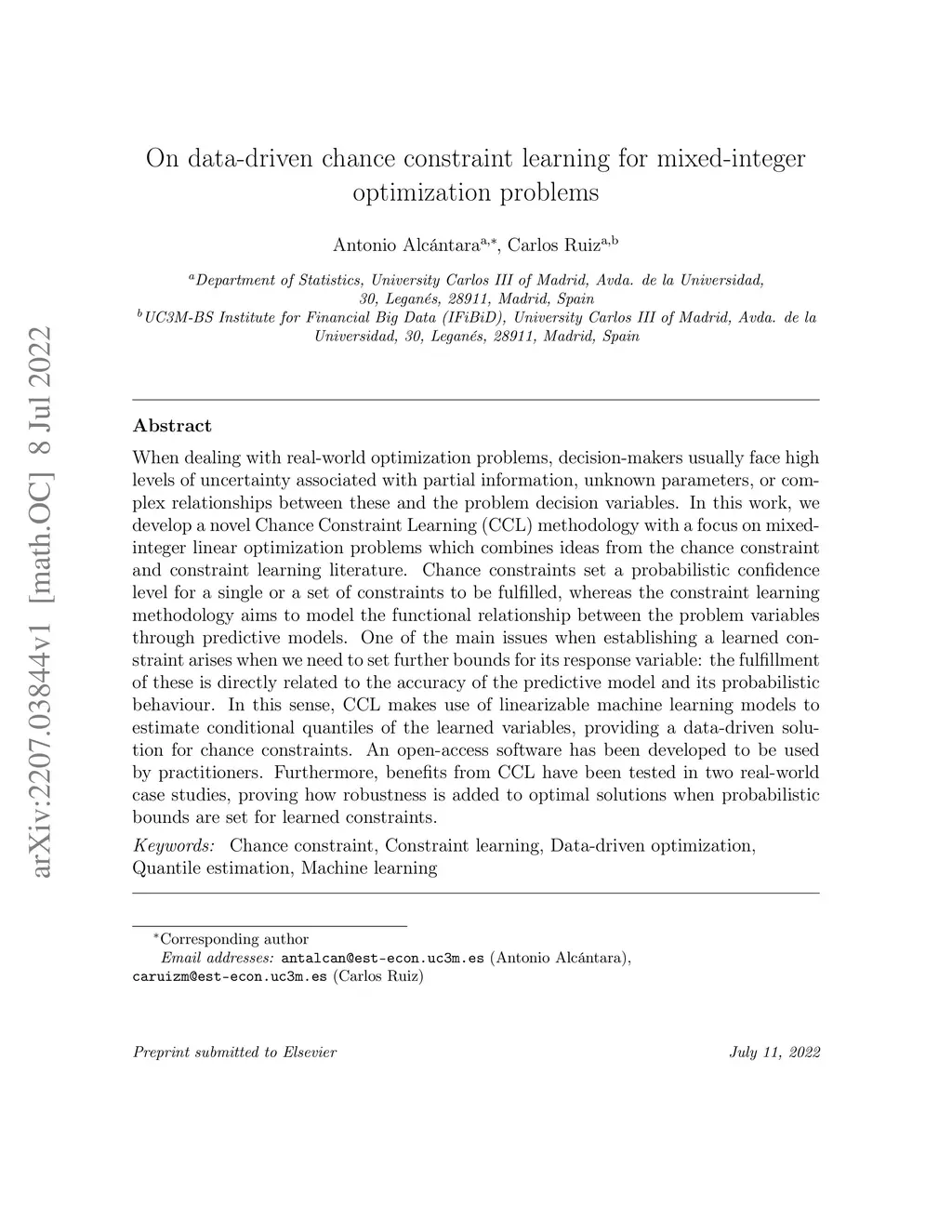 When dealing with real-world optimization problems, decision-makers usually face high levels of uncertainty associated with partial information, unknown parameters, or complex relationships between these and the problem decision variables. In this work, we develop a novel Chance Constraint Learning (CCL) methodology with a focus on mixed-integer linear optimization problems which combines ideas from the chance constraint and constraint learning literature. Chance constraints set a probabilistic confidence level for a single or a set of constraints to be fulfilled, whereas the constraint learning methodology aims to model the functional relationship between the problem variables through predictive models. One of the main issues when establishing a learned constraint arises when we need to set further bounds for its response variable: the fulfillment of these is directly related to the accuracy of the predictive model and its probabilistic behaviour. In this sense, CCL makes use of linearizable machine learning models to estimate conditional quantiles of the learned variables, providing a data-driven solution for chance constraints. An open-access software has been developed to be used by practitioners. Furthermore, benefits from CCL have been tested in two real-world case studies, proving how robustness is added to optimal solutions when probabilistic bounds are set for learned constraints.