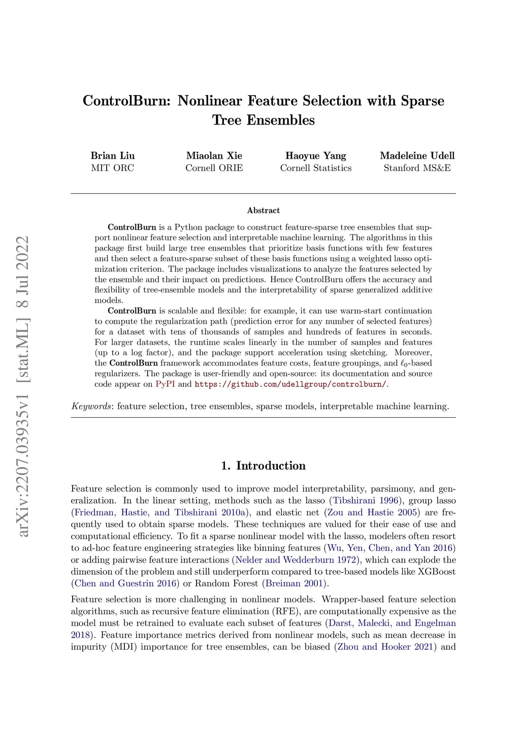 ControlBurn is a Python package to construct feature-sparse tree ensembles that support nonlinear feature selection and interpretable machine learning. The algorithms in this package first build large tree ensembles that prioritize basis functions with few features and then select a feature-sparse subset of these basis functions using a weighted lasso optimization criterion. The package includes visualizations to analyze the features selected by the ensemble and their impact on predictions. Hence ControlBurn offers the accuracy and flexibility of tree-ensemble models and the interpretability of sparse generalized additive models. ControlBurn is scalable and flexible: for example, it can use warm-start continuation to compute the regularization path (prediction error for any number of selected features) for a dataset with tens of thousands of samples and hundreds of features in seconds. For larger datasets, the runtime scales linearly in the number of samples and features (up to a log factor), and the package support acceleration using sketching. Moreover, the ControlBurn framework accommodates feature costs, feature groupings, and -based regularizers. The package is user-friendly and open-source: its documentation and source code appear on https://pypi.org/project/ControlBurn/ and https://github.com/udellgroup/controlburn/.