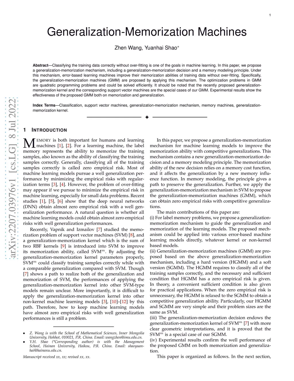 Classifying the training data correctly without over-fitting is one of the goals in machine learning. In this paper, we propose a generalization-memorization mechanism, including a generalization-memorization decision and a memory modeling principle. Under this mechanism, error-based learning machines improve their memorization abilities of training data without over-fitting. Specifically, the generalization-memorization machines (GMM) are proposed by applying this mechanism. The optimization problems in GMM are quadratic programming problems and could be solved efficiently. It should be noted that the recently proposed generalization-memorization kernel and the corresponding support vector machines are the special cases of our GMM. Experimental results show the effectiveness of the proposed GMM both on memorization and generalization.
