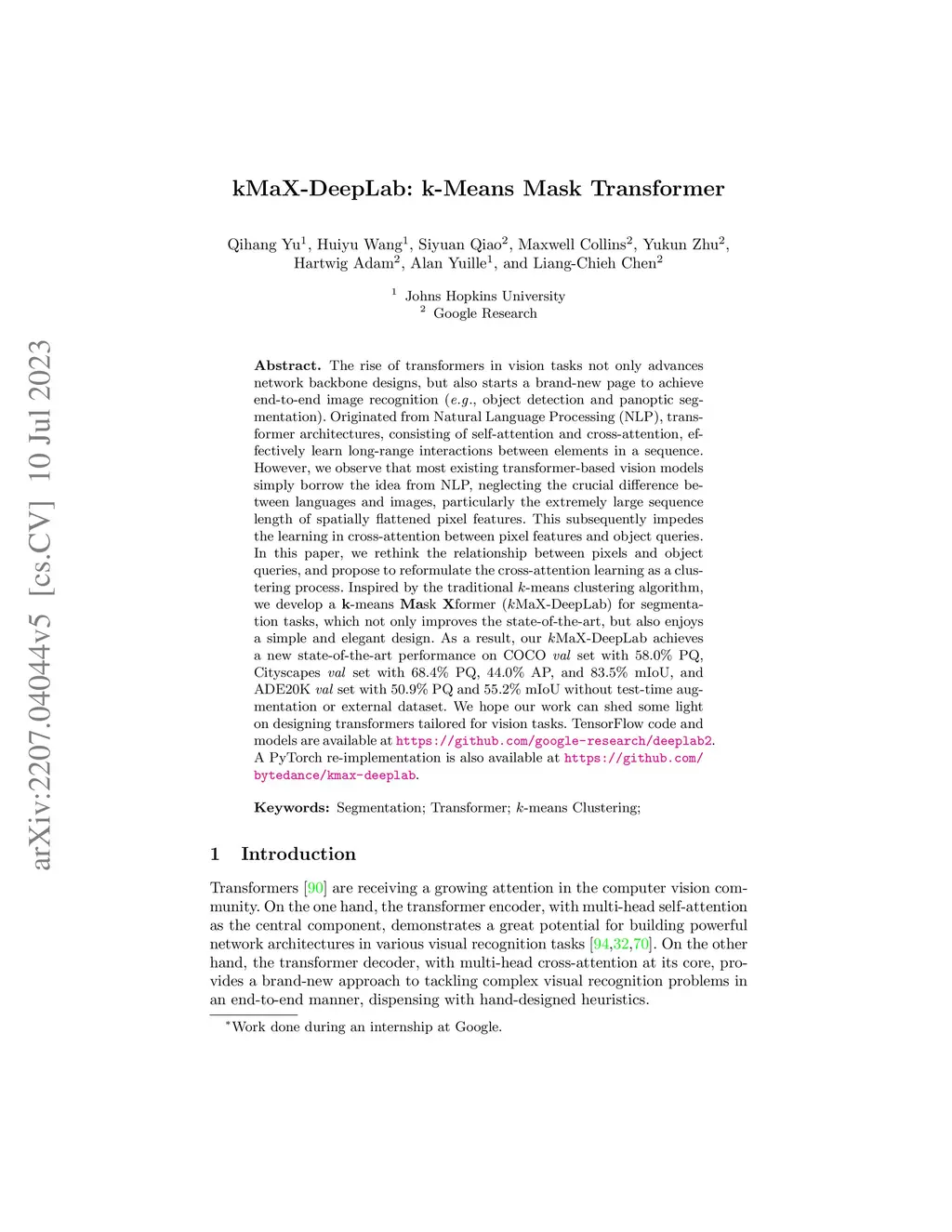 kMaX-DeepLab: k-means Mask Transformer