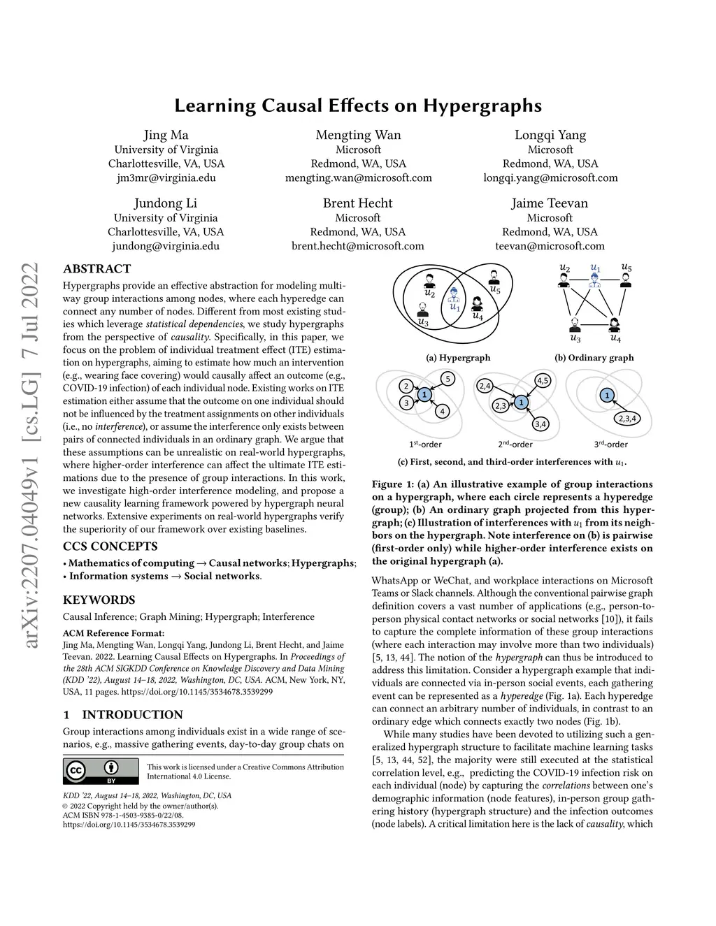Hypergraphs provide an effective abstraction for modeling multi-way group interactions among nodes, where each hyperedge can connect any number of nodes. Different from most existing studies which leverage statistical dependencies, we study hypergraphs from the perspective of causality. Specifically, in this paper, we focus on the problem of individual treatment effect (ITE) estimation on hypergraphs, aiming to estimate how much an intervention (e.g., wearing face covering) would causally affect an outcome (e.g., COVID-19 infection) of each individual node. Existing works on ITE estimation either assume that the outcome on one individual should not be influenced by the treatment assignments on other individuals (i.e., no interference), or assume the interference only exists between pairs of connected individuals in an ordinary graph. We argue that these assumptions can be unrealistic on real-world hypergraphs, where higher-order interference can affect the ultimate ITE estimations due to the presence of group interactions. In this work, we investigate high-order interference modeling, and propose a new causality learning framework powered by hypergraph neural networks. Extensive experiments on real-world hypergraphs verify the superiority of our framework over existing baselines.