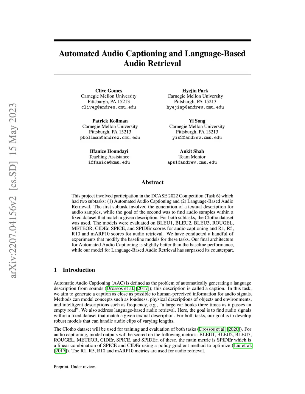 This project involved participation in the DCASE 2022 Competition (Task 6) which had two subtasks: (1) Automated Audio Captioning and (2) Language-Based Audio Retrieval. The first subtask involved the generation of a textual description for audio samples, while the goal of the second was to find audio samples within a fixed dataset that match a given description. For both subtasks, the Clotho dataset was used. The models were evaluated on BLEU1, BLEU2, BLEU3, ROUGEL, METEOR, CIDEr, SPICE, and SPIDEr scores for audio captioning and R1, R5, R10 and mARP10 scores for audio retrieval. We have conducted a handful of experiments that modify the baseline models for these tasks. Our final architecture for Automated Audio Captioning is close to the baseline performance, while our model for Language-Based Audio Retrieval has surpassed its counterpart.