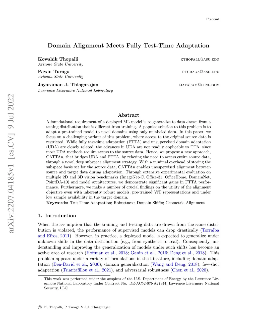 A foundational requirement of a deployed ML model is to generalize to data drawn from a testing distribution that is different from training. A popular solution to this problem is to adapt a pre-trained model to novel domains using only unlabeled data. In this paper, we focus on a challenging variant of this problem, where access to the original source data is restricted. While fully test-time adaptation (FTTA) and unsupervised domain adaptation (UDA) are closely related, the advances in UDA are not readily applicable to TTA, since most UDA methods require access to the source data. Hence, we propose a new approach, CATTAn, that bridges UDA and FTTA, by relaxing the need to access entire source data, through a novel deep subspace alignment strategy. With a minimal overhead of storing the subspace basis set for the source data, CATTAn enables unsupervised alignment between source and target data during adaptation. Through extensive experimental evaluation on multiple 2D and 3D vision benchmarks (ImageNet-C, Office-31, OfficeHome, DomainNet, PointDA-10) and model architectures, we demonstrate significant gains in FTTA performance. Furthermore, we make a number of crucial findings on the utility of the alignment objective even with inherently robust models, pre-trained ViT representations and under low sample availability in the target domain.