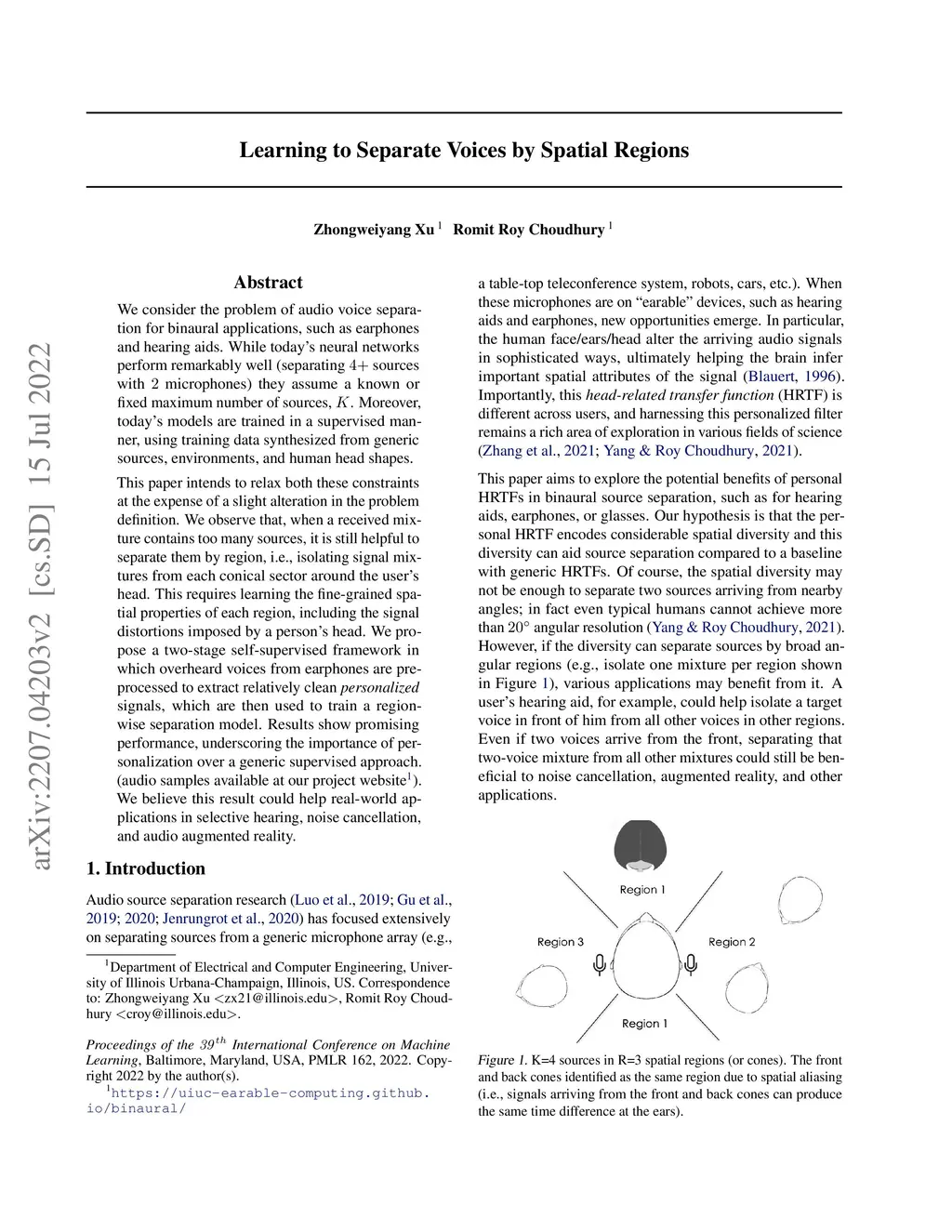 We consider the problem of audio voice separation for binaural applications, such as earphones and hearing aids. While today's neural networks perform remarkably well (separating sources with 2 microphones) they assume a known or fixed maximum number of sources, K. Moreover, today's models are trained in a supervised manner, using training data synthesized from generic sources, environments, and human head shapes. This paper intends to relax both these constraints at the expense of a slight alteration in the problem definition. We observe that, when a received mixture contains too many sources, it is still helpful to separate them by region, i.e., isolating signal mixtures from each conical sector around the user's head. This requires learning the fine-grained spatial properties of each region, including the signal distortions imposed by a person's head. We propose a two-stage self-supervised framework in which overheard voices from earphones are pre-processed to extract relatively clean personalized signals, which are then used to train a region-wise separation model. Results show promising performance, underscoring the importance of personalization over a generic supervised approach. (audio samples available at our project website: https://uiuc-earable-computing.github.io/binaural/. We believe this result could help real-world applications in selective hearing, noise cancellation, and audio augmented reality.