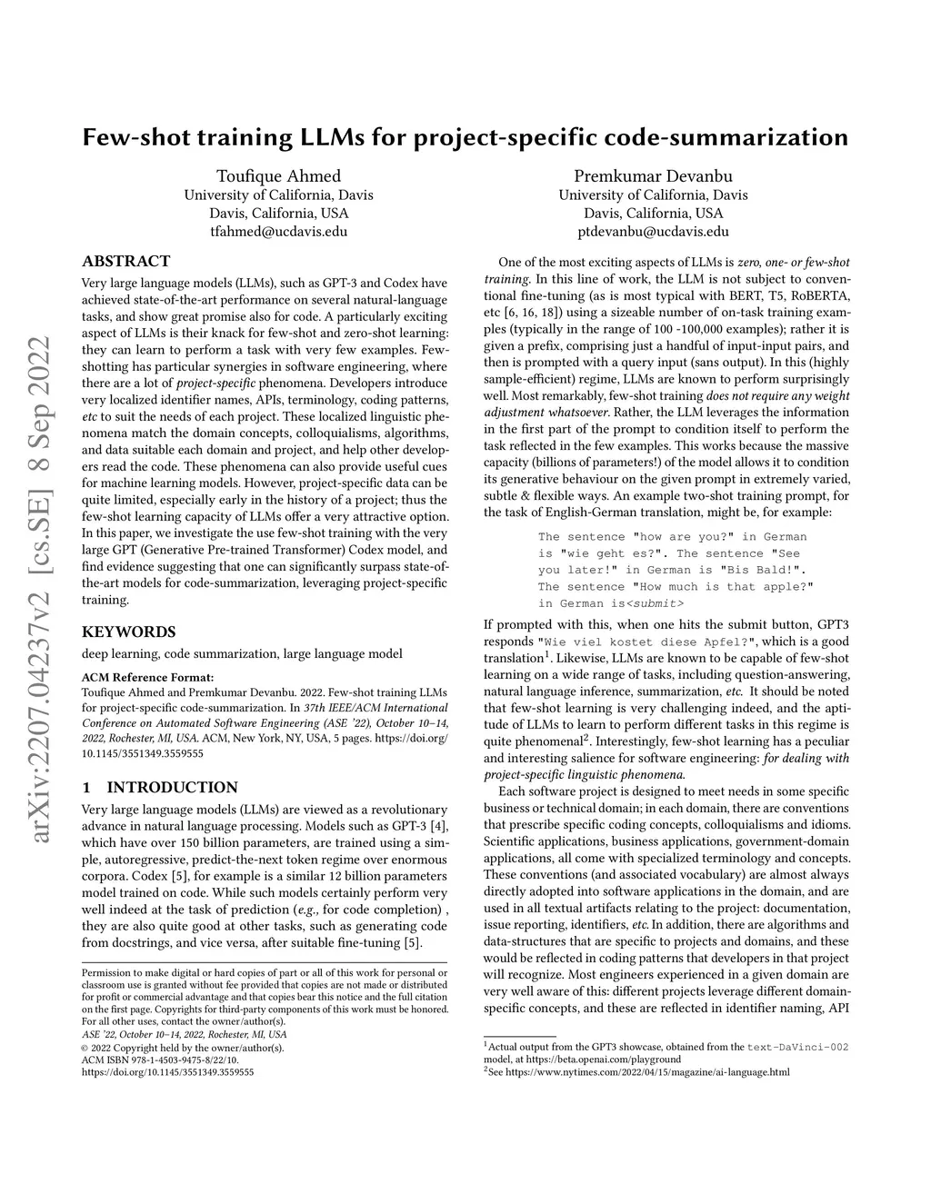 Very large language models (LLMs), such as GPT-3 and Codex have achieved state-of-the-art performance on several natural-language tasks, and show great promise also for code. A particularly exciting aspect of LLMs is their knack for few-shot and zero-shot learning: they can learn to perform a task with very few examples. Few-shotting has particular synergies in software engineering, where there are a lot of phenomena (identifier names, APIs, terminology, coding patterns) that are known to be highly project-specific. However, project-specific data can be quite limited, especially early in the history of a project; thus the few-shot learning capacity of LLMs might be very relevant. In this paper, we investigate the use few-shot training with the very large GPT (Generative Pre-trained Transformer) Codex model, and find evidence suggesting that one can significantly surpass state-of-the-art models for code-summarization, leveraging project-specific training.