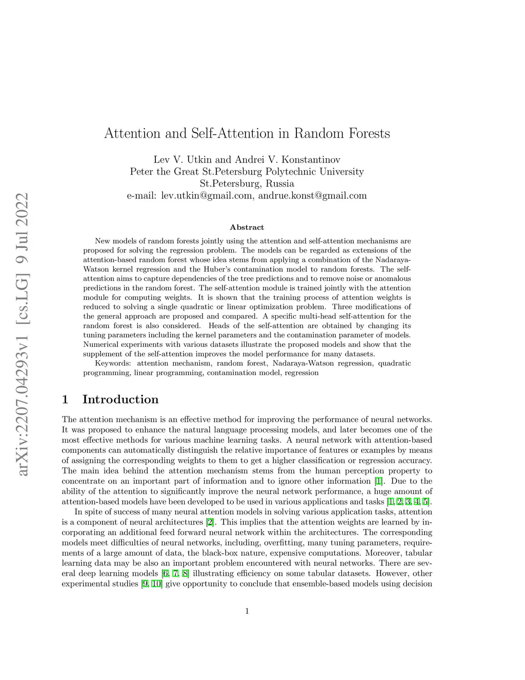New models of random forests jointly using the attention and self-attention mechanisms are proposed for solving the regression problem. The models can be regarded as extensions of the attention-based random forest whose idea stems from applying a combination of the Nadaraya-Watson kernel regression and the Huber's contamination model to random forests. The self-attention aims to capture dependencies of the tree predictions and to remove noise or anomalous predictions in the random forest. The self-attention module is trained jointly with the attention module for computing weights. It is shown that the training process of attention weights is reduced to solving a single quadratic or linear optimization problem. Three modifications of the general approach are proposed and compared. A specific multi-head self-attention for the random forest is also considered. Heads of the self-attention are obtained by changing its tuning parameters including the kernel parameters and the contamination parameter of models. Numerical experiments with various datasets illustrate the proposed models and show that the supplement of the self-attention improves the model performance for many datasets.
