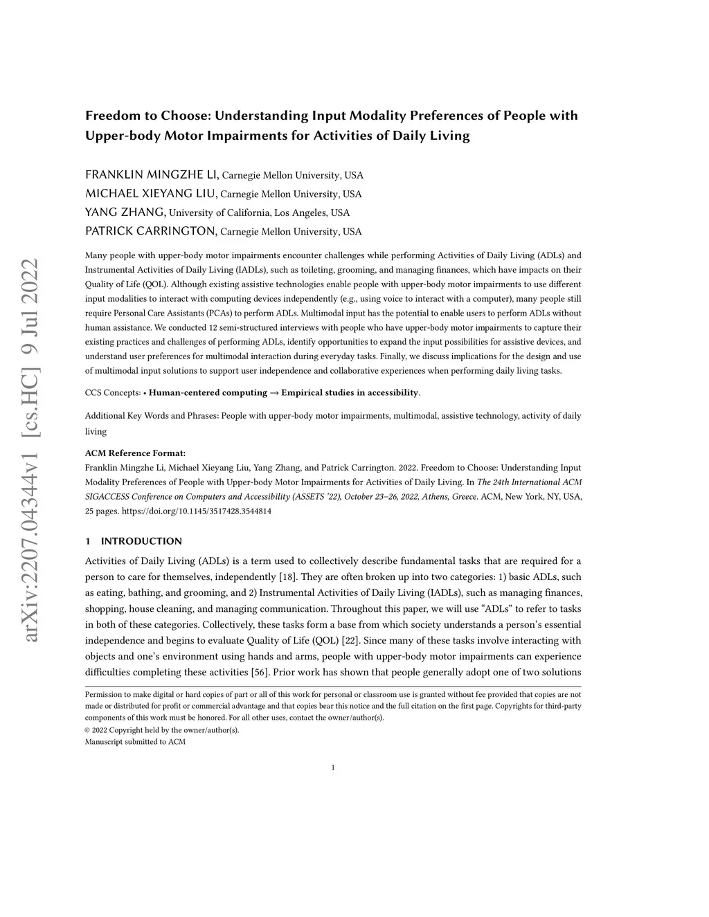 Many people with upper-body motor impairments encounter challenges while performing Activities of Daily Living (ADLs) and Instrumental Activities of Daily Living (IADLs), such as toileting, grooming, and managing finances, which have impacts on their Quality of Life (QOL). Although existing assistive technologies enable people with upper-body motor impairments to use different input modalities to interact with computing devices independently (e.g., using voice to interact with a computer), many people still require Personal Care Assistants (PCAs) to perform ADLs. Multimodal input has the potential to enable users to perform ADLs without human assistance. We conducted 12 semi-structured interviews with people who have upper-body motor impairments to capture their existing practices and challenges of performing ADLs, identify opportunities to expand the input possibilities for assistive devices, and understand user preferences for multimodal interaction during everyday tasks. Finally, we discuss implications for the design and use of multimodal input solutions to support user independence and collaborative experiences when performing daily living tasks.