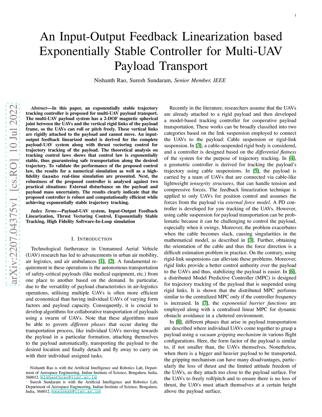 In this paper, an exponentially stable trajectory tracking controller is proposed for multi-UAV payload transport. The multi-UAV payload system has a 2-DOF magnetic spherical joint between the UAVs and the vertical rigid links of the payload frame, so the UAVs can roll or pitch freely. These vertical links are rigidly attached to the payload and cannot move. An input-output feedback linearized model is derived for the complete payload-UAV system along with thrust vectoring control for trajectory tracking of the payload. The theoretical analysis on tracking control laws shows that control law is exponentially stable, thus guaranteeing safe transportation along the desired trajectory. To validate the performance of the proposed control law, the results for a numerical simulation as well as a high-fidelity Gazebo real-time simulation are presented. Next, the robustness of the proposed controller is analyzed against two practical situations: External disturbance on the payload and payload mass uncertainty. The results clearly indicate that the proposed controller is robust and computationally efficient while achieving exponentially stable trajectory tracking.