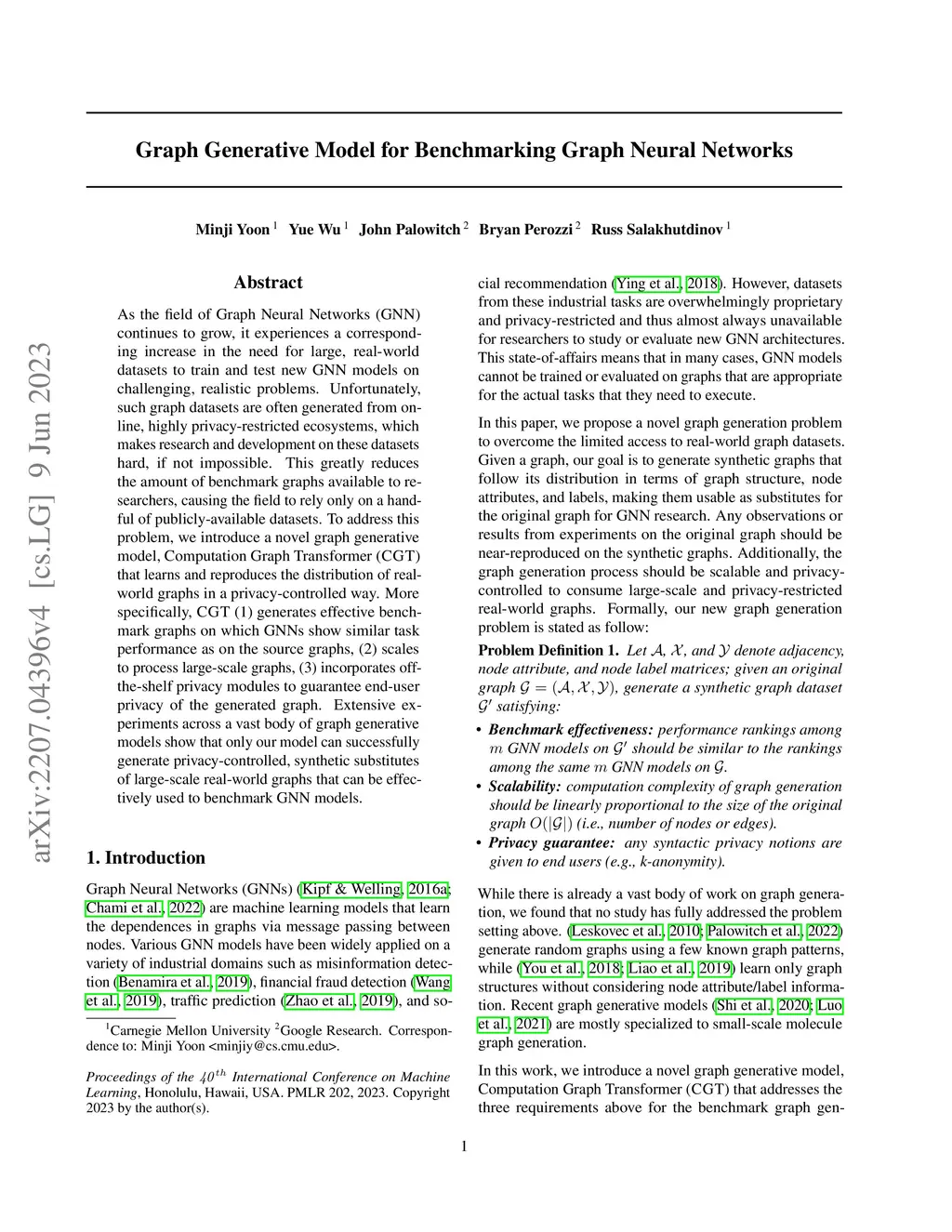 As the field of Graph Neural Networks (GNN) continues to grow, it experiences a corresponding increase in the need for large, real-world datasets to train and test new GNN models on challenging, realistic problems. Unfortunately, such graph datasets are often generated from online, highly privacy-restricted ecosystems, which makes research and development on these datasets hard, if not impossible. This greatly reduces the amount of benchmark graphs available to researchers, causing the field to rely only on a handful of publicly-available datasets. To address this problem, we introduce a novel graph generative model, Computation Graph Transformer (CGT) that learns and reproduces the distribution of real-world graphs in a privacy-controlled way. More specifically, CGT (1) generates effective benchmark graphs on which GNNs show similar task performance as on the source graphs, (2) scales to process large-scale graphs, (3) incorporates off-the-shelf privacy modules to guarantee end-user privacy of the generated graph. Extensive experiments across a vast body of graph generative models show that only our model can successfully generate privacy-controlled, synthetic substitutes of large-scale real-world graphs that can be effectively used to benchmark GNN models.