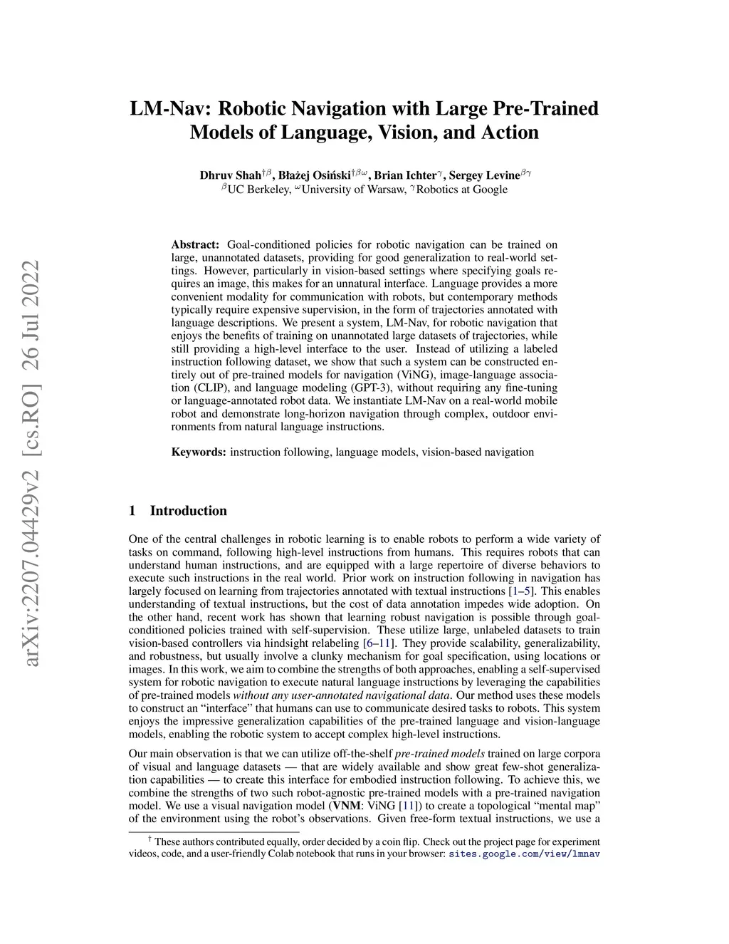 LM-Nav: Robotic Navigation with Large Pre-Trained Models of Language,