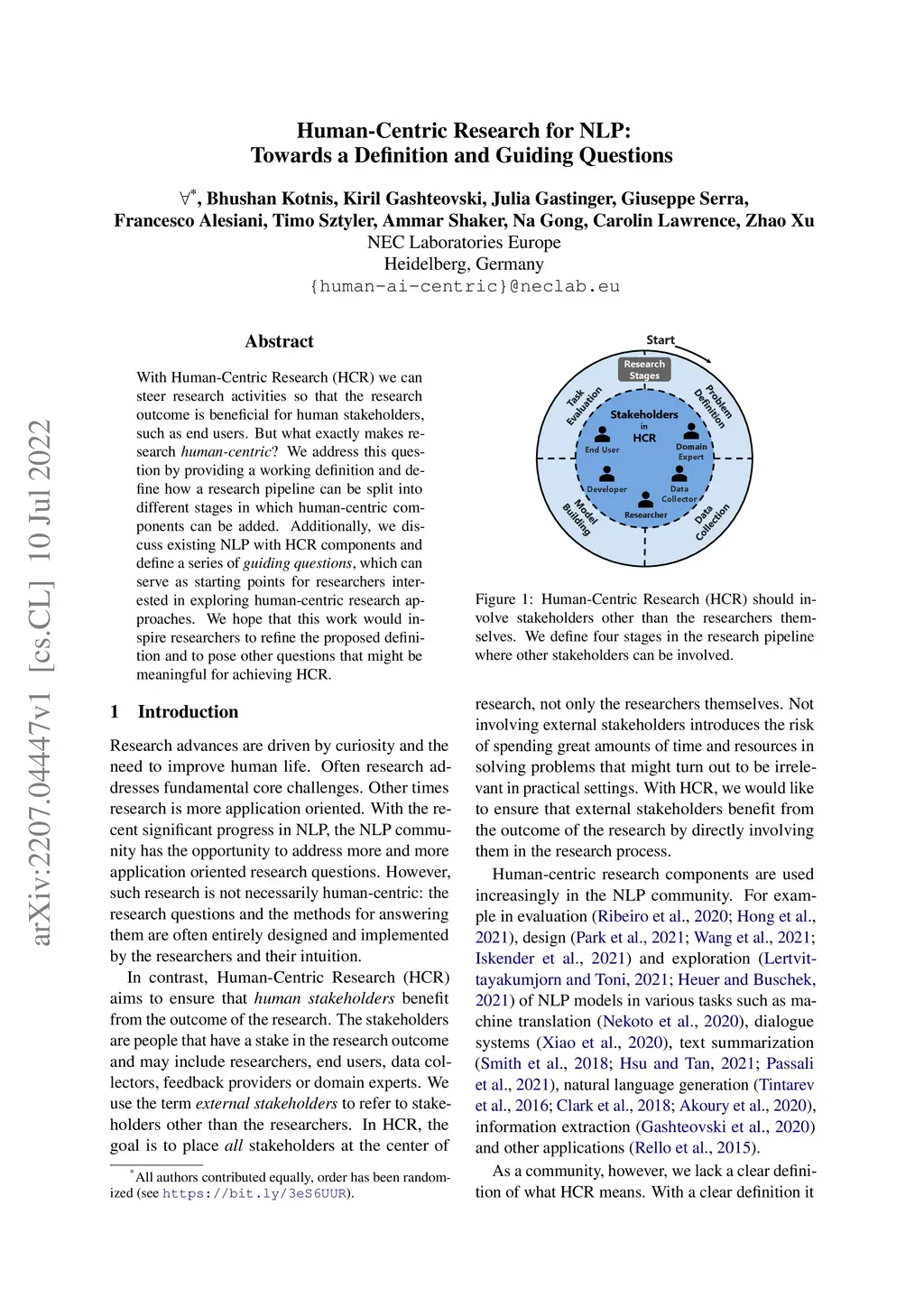 With Human-Centric Research (HCR) we can steer research activities so that the research outcome is beneficial for human stakeholders, such as end users. But what exactly makes research human-centric? We address this question by providing a working definition and define how a research pipeline can be split into different stages in which human-centric components can be added. Additionally, we discuss existing NLP with HCR components and define a series of guiding questions, which can serve as starting points for researchers interested in exploring human-centric research approaches. We hope that this work would inspire researchers to refine the proposed definition and to pose other questions that might be meaningful for achieving HCR.