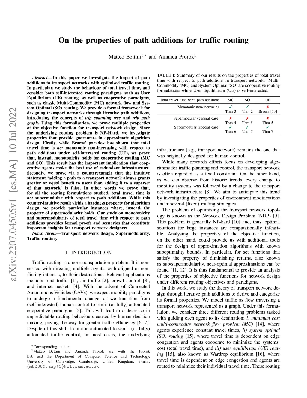 In this paper we investigate the impact of path additions to transport networks with optimised traffic routing. In particular, we study the behaviour of total travel time, and consider both self-interested routing paradigms, such as User Equilibrium (UE) routing, as well as cooperative paradigms, such as classic Multi-Commodity (MC) network flow and System Optimal (SO) routing. We provide a formal framework for designing transport networks through iterative path additions, introducing the concepts of trip spanning tree and trip path graph. Using this formalisation, we prove multiple properties of the objective function for transport network design. Since the underlying routing problem is NP-Hard, we investigate properties that provide guarantees in approximate algorithm design. Firstly, while Braess' paradox has shown that total travel time is not monotonic non-increasing with respect to path additions under self-interested routing (UE), we prove that, instead, monotonicity holds for cooperative routing (MC and SO). This result has the important implication that cooperative agents make the best use of redundant infrastructure. Secondly, we prove via a counterexample that the intuitive statement `adding a path to a transport network always grants greater or equal benefit to users than adding it to a superset of that network' is false. In other words we prove that, for all the routing formulations studied, total travel time is not supermodular with respect to path additions. While this counter-intuitive result yields a hardness property for algorithm design, we provide particular instances where, instead, the property of supermodularity holds. Our study on monotonicity and supermodularity of total travel time with respect to path additions provides formal proofs and scenarios that constitute important insights for transport network designers.