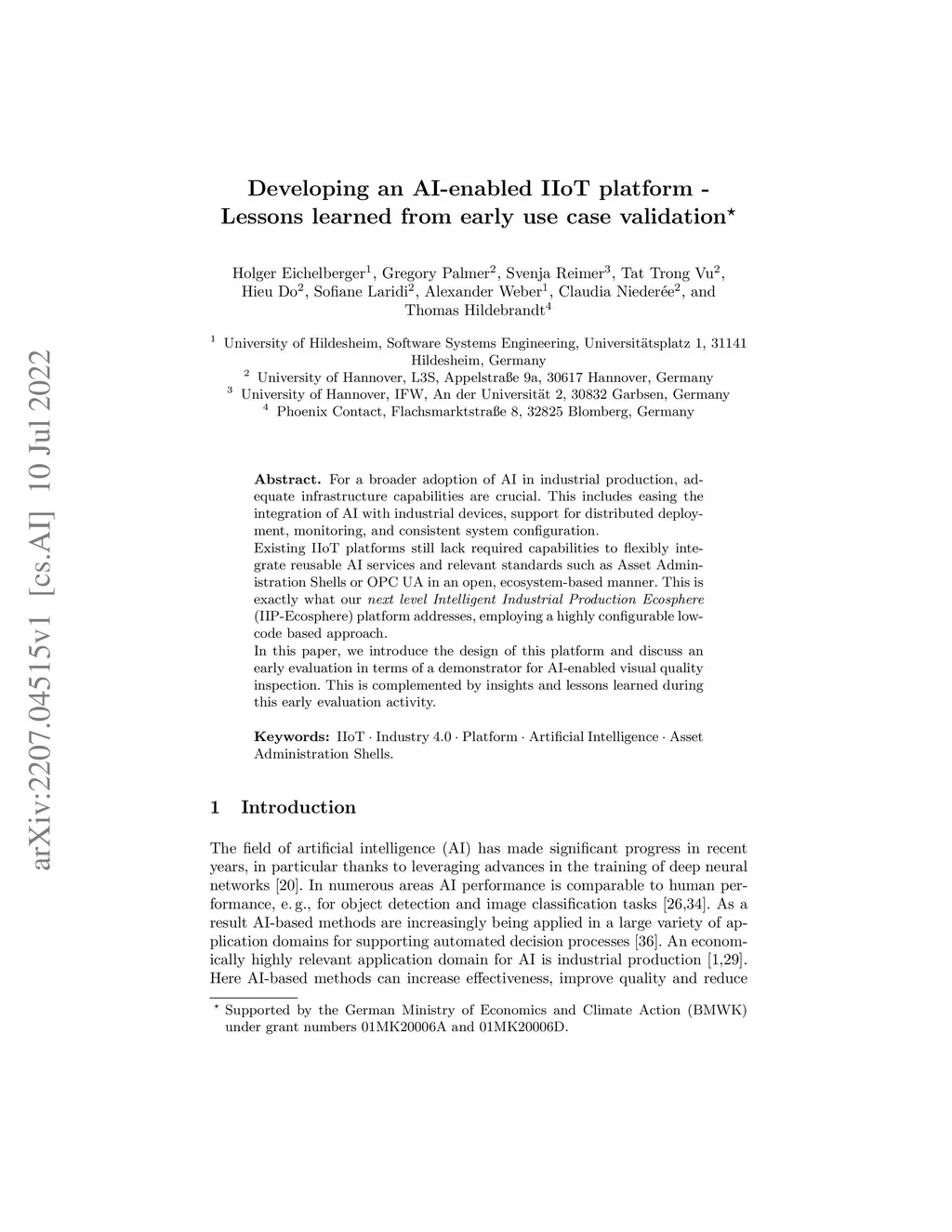 For a broader adoption of AI in industrial production, adequate infrastructure capabilities are crucial. This includes easing the integration of AI with industrial devices, support for distributed deployment, monitoring, and consistent system configuration. Existing IIoT platforms still lack required capabilities to flexibly integrate reusable AI services and relevant standards such as Asset Administration Shells or OPC UA in an open, ecosystem-based manner. This is exactly what our next level Intelligent Industrial Production Ecosphere (IIP-Ecosphere) platform addresses, employing a highly configurable low-code based approach. In this paper, we introduce the design of this platform and discuss an early evaluation in terms of a demonstrator for AI-enabled visual quality inspection. This is complemented by insights and lessons learned during this early evaluation activity.
