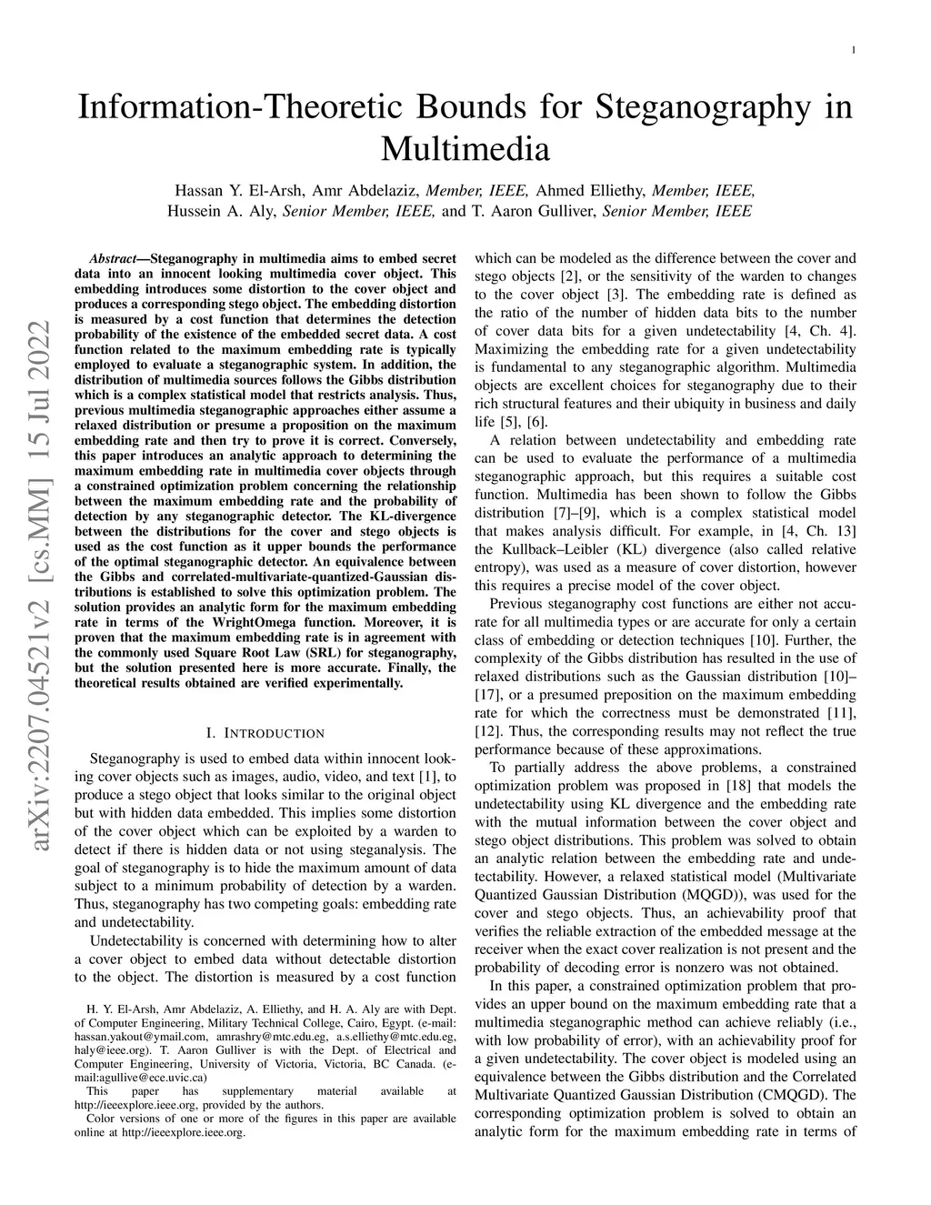 Steganography in multimedia aims to embed secret data into an innocent looking multimedia cover object. This embedding introduces some distortion to the cover object and produces a corresponding stego object. The embedding distortion is measured by a cost function that determines the detection probability of the existence of the embedded secret data. A cost function related to the maximum embedding rate is typically employed to evaluate a steganographic system. In addition, the distribution of multimedia sources follows the Gibbs distribution which is a complex statistical model that restricts analysis. Thus, previous multimedia steganographic approaches either assume a relaxed distribution or presume a proposition on the maximum embedding rate and then try to prove it is correct. Conversely, this paper introduces an analytic approach to determining the maximum embedding rate in multimedia cover objects through a constrained optimization problem concerning the relationship between the maximum embedding rate and the probability of detection by any steganographic detector. The KL-divergence between the distributions for the cover and stego objects is used as the cost function as it upper bounds the performance of the optimal steganographic detector. An equivalence between the Gibbs and correlated-multivariate-quantized-Gaussian distributions is established to solve this optimization problem. The solution provides an analytic form for the maximum embedding rate in terms of the WrightOmega function. Moreover, it is proven that the maximum embedding rate is in agreement with the commonly used Square Root Law (SRL) for steganography, but the solution presented here is more accurate. Finally, the theoretical results obtained are verified experimentally.