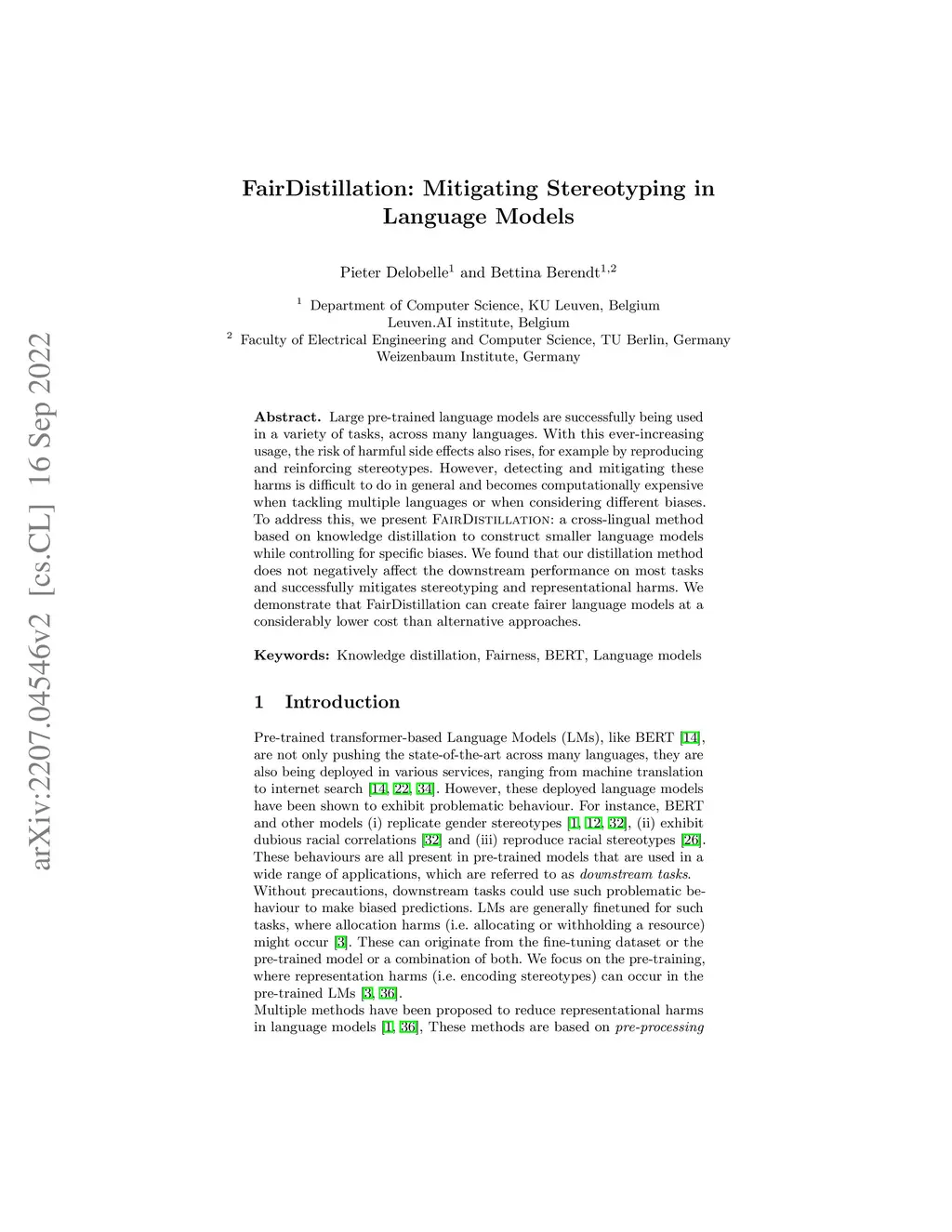 Large pre-trained language models are successfully being used in a variety of tasks, across many languages. With this ever-increasing usage, the risk of harmful side effects also rises, for example by reproducing and reinforcing stereotypes. However, detecting and mitigating these harms is difficult to do in general and becomes computationally expensive when tackling multiple languages or when considering different biases. To address this, we present FairDistillation: a cross-lingual method based on knowledge distillation to construct smaller language models while controlling for specific biases. We found that our distillation method does not negatively affect the downstream performance on most tasks and successfully mitigates stereotyping and representational harms. We demonstrate that FairDistillation can create fairer language models at a considerably lower cost than alternative approaches.