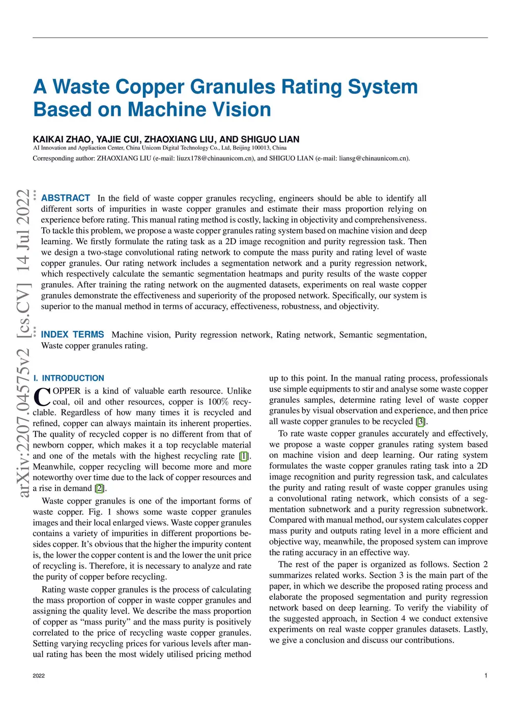 In the field of waste copper granules recycling, engineers should be able to identify all different sorts of impurities in waste copper granules and estimate their mass proportion relying on experience before rating. This manual rating method is costly, lacking in objectivity and comprehensiveness. To tackle this problem, we propose a waste copper granules rating system based on machine vision and deep learning. We firstly formulate the rating task into a 2D image recognition and purity regression task. Then we design a two-stage convolutional rating network to compute the mass purity and rating level of waste copper granules. Our rating network includes a segmentation network and a purity regression network, which respectively calculate the semantic segmentation heatmaps and purity results of the waste copper granules. After training the rating network on the augmented datasets, experiments on real waste copper granules demonstrate the effectiveness and superiority of the proposed network. Specifically, our system is superior to the manual method in terms of accuracy, effectiveness, robustness, and objectivity.