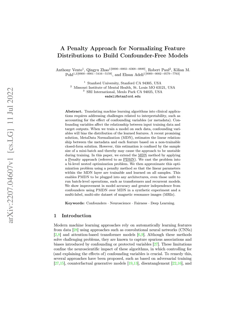 Translating machine learning algorithms into clinical applications requires addressing challenges related to interpretability, such as accounting for the effect of confounding variables (or metadata). Confounding variables affect the relationship between input training data and target outputs. When we train a model on such data, confounding variables will bias the distribution of the learned features. A recent promising solution, MetaData Normalization (MDN), estimates the linear relationship between the metadata and each feature based on a non-trainable closed-form solution. However, this estimation is confined by the sample size of a mini-batch and thereby may cause the approach to be unstable during training. In this paper, we extend the MDN method by applying a Penalty approach (referred to as PDMN). We cast the problem into a bi-level nested optimization problem. We then approximate this optimization problem using a penalty method so that the linear parameters within the MDN layer are trainable and learned on all samples. This enables PMDN to be plugged into any architectures, even those unfit to run batch-level operations, such as transformers and recurrent models. We show improvement in model accuracy and greater independence from confounders using PMDN over MDN in a synthetic experiment and a multi-label, multi-site dataset of magnetic resonance images (MRIs).