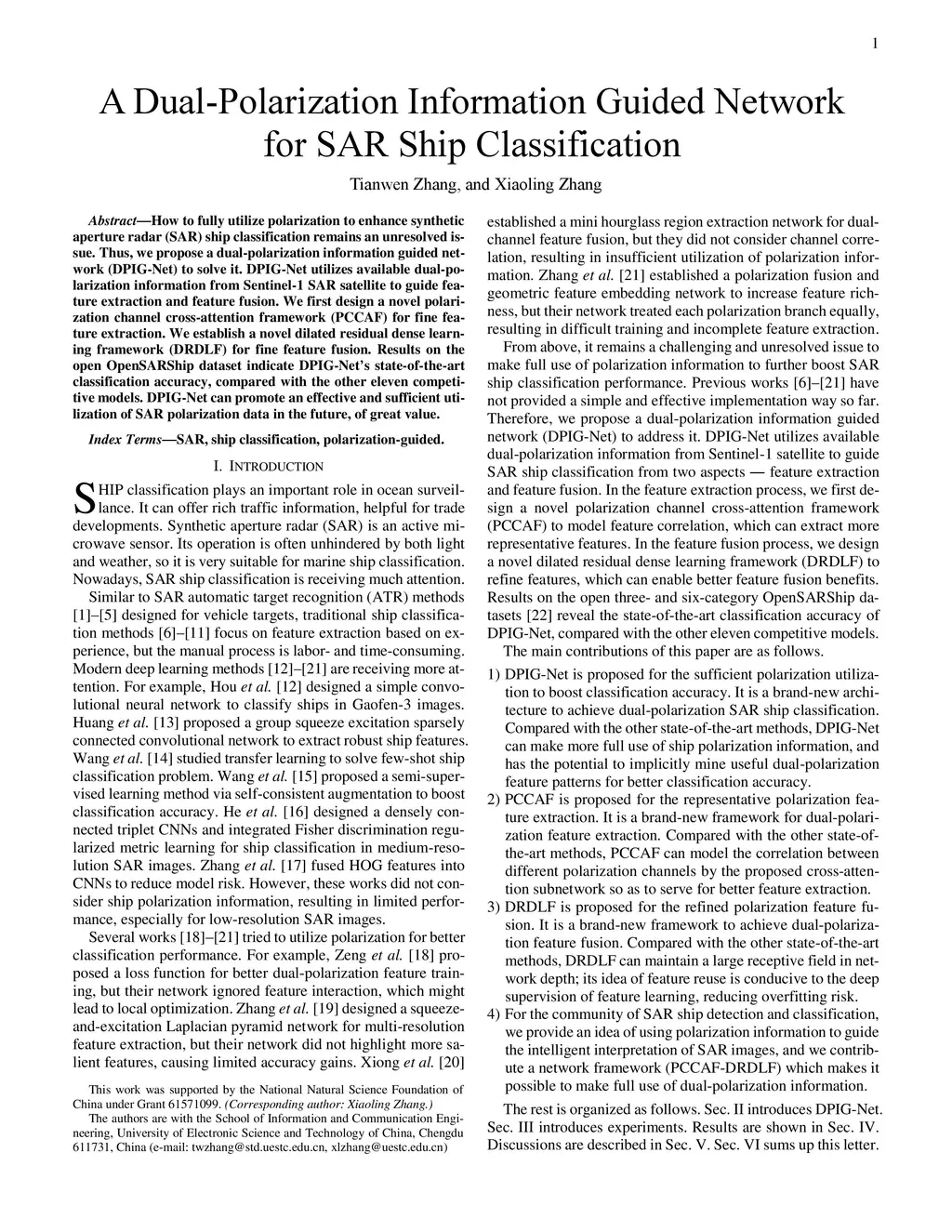 How to fully utilize polarization to enhance synthetic aperture radar (SAR) ship classification remains an unresolved issue. Thus, we propose a dual-polarization information guided network (DPIG-Net) to solve it.