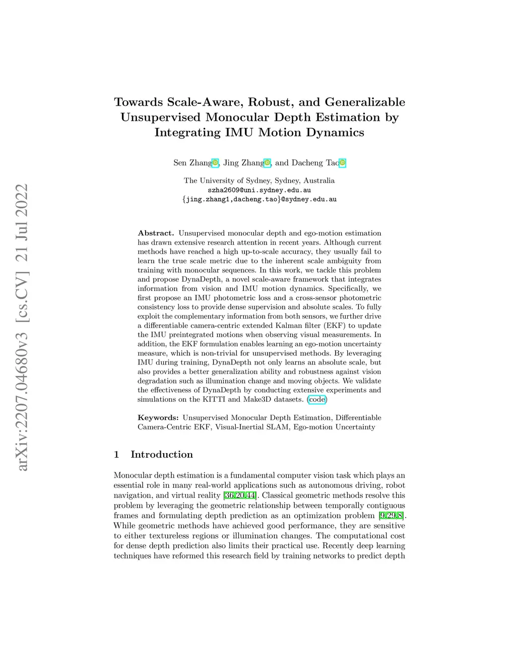 Unsupervised monocular depth and ego-motion estimation has drawn extensive research attention in recent years. Although current methods have reached a high up-to-scale accuracy, they usually fail to learn the true scale metric due to the inherent scale ambiguity from training with monocular sequences. In this work, we tackle this problem and propose DynaDepth, a novel scale-aware framework that integrates information from vision and IMU motion dynamics. Specifically, we first propose an IMU photometric loss and a cross-sensor photometric consistency loss to provide dense supervision and absolute scales. To fully exploit the complementary information from both sensors, we further drive a differentiable camera-centric extended Kalman filter (EKF) to update the IMU preintegrated motions when observing visual measurements. In addition, the EKF formulation enables learning an ego-motion uncertainty measure, which is non-trivial for unsupervised methods. By leveraging IMU during training, DynaDepth not only learns an absolute scale, but also provides a better generalization ability and robustness against vision degradation such as illumination change and moving objects. We validate the effectiveness of DynaDepth by conducting extensive experiments and simulations on the KITTI and Make3D datasets.