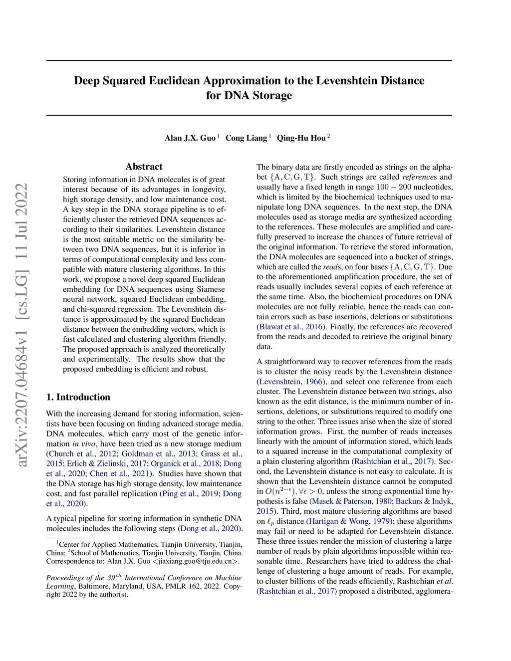 Storing information in DNA molecules is of great interest because of its advantages in longevity, high storage density, and low maintenance cost. A key step in the DNA storage pipeline is to efficiently cluster the retrieved DNA sequences according to their similarities. Levenshtein distance is the most suitable metric on the similarity between two DNA sequences, but it is inferior in terms of computational complexity and less compatible with mature clustering algorithms. In this work, we propose a novel deep squared Euclidean embedding for DNA sequences using Siamese neural network, squared Euclidean embedding, and chi-squared regression. The Levenshtein distance is approximated by the squared Euclidean distance between the embedding vectors, which is fast calculated and clustering algorithm friendly. The proposed approach is analyzed theoretically and experimentally. The results show that the proposed embedding is efficient and robust.