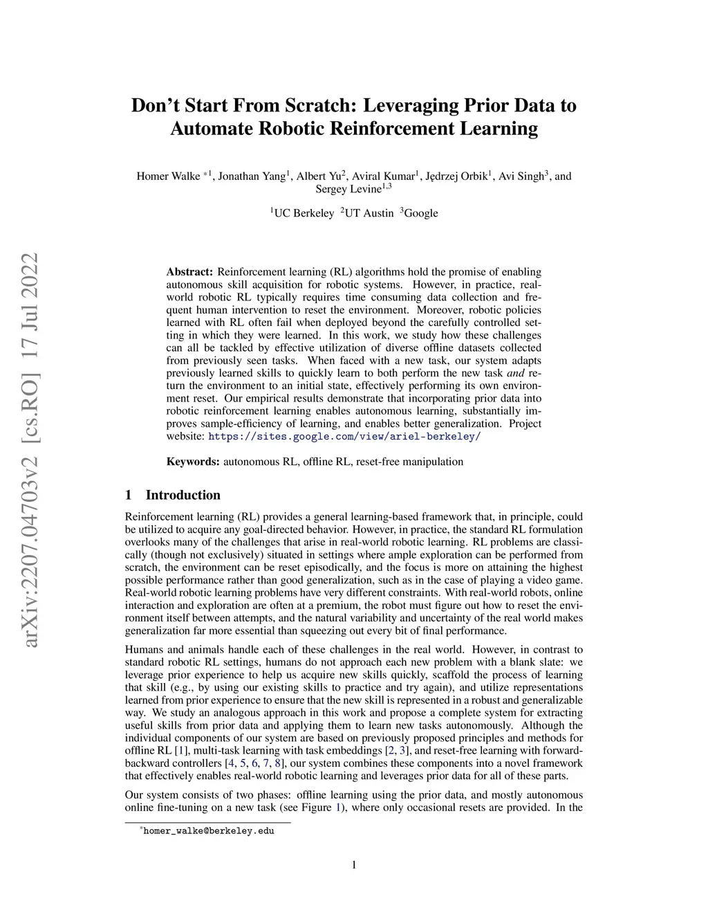 Reinforcement learning (RL) algorithms hold the promise of enabling autonomous skill acquisition for robotic systems. However, in practice, real-world robotic RL typically requires time consuming data collection and frequent human intervention to reset the environment. Moreover, robotic policies learned with RL often fail when deployed beyond the carefully controlled setting in which they were learned. In this work, we study how these challenges can all be tackled by effective utilization of diverse offline datasets collected from previously seen tasks. When faced with a new task, our system adapts previously learned skills to quickly learn to both perform the new task and return the environment to an initial state, effectively performing its own environment reset. Our empirical results demonstrate that incorporating prior data into robotic reinforcement learning enables autonomous learning, substantially improves sample-efficiency of learning, and enables better generalization. Project website: https://sites.google.com/view/ariel-berkeley/