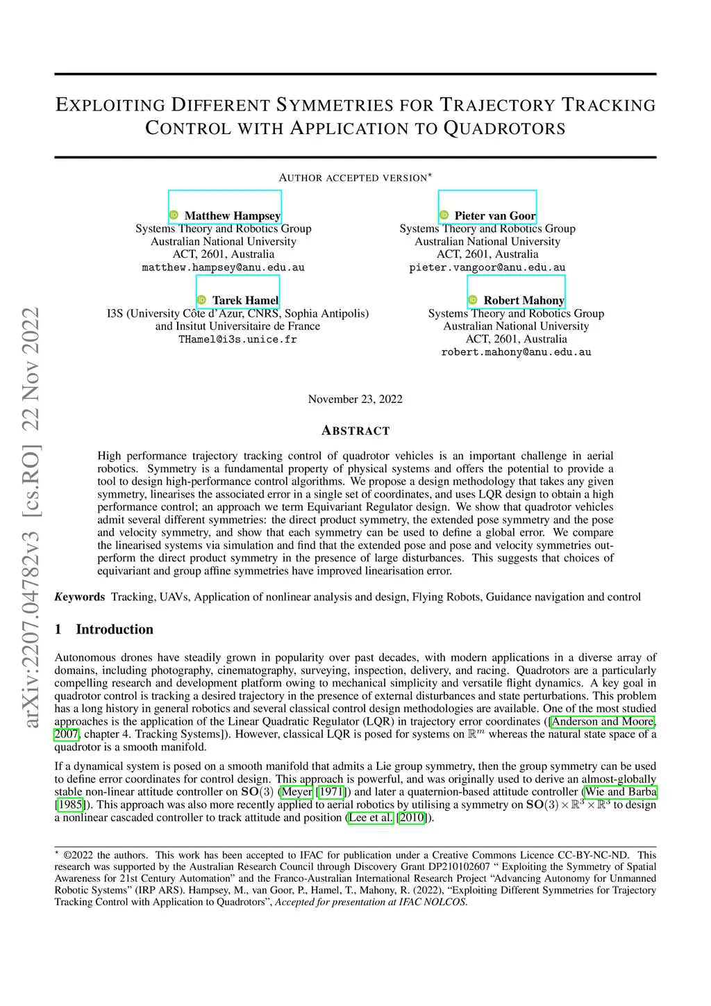 High performance trajectory tracking control of quadrotor vehicles is an important challenge in aerial robotics. Symmetry is a fundamental property of physical systems and offers the potential to provide a tool to design high-performance control algorithms. We propose a design methodology that takes any given symmetry, linearises the associated error in a single set of coordinates, and uses LQR design to obtain a high performance control; an approach we term Equivariant Regulator design. We show that quadrotor vehicles admit several different symmetries: the direct product symmetry, the extended pose symmetry and the pose and velocity symmetry, and show that each symmetry can be used to define a global error. We compare the linearised systems via simulation and find that the extended pose and pose and velocity symmetries outperform the direct product symmetry in the presence of large disturbances. This suggests that choices of equivariant and group affine symmetries have improved linearisation error.