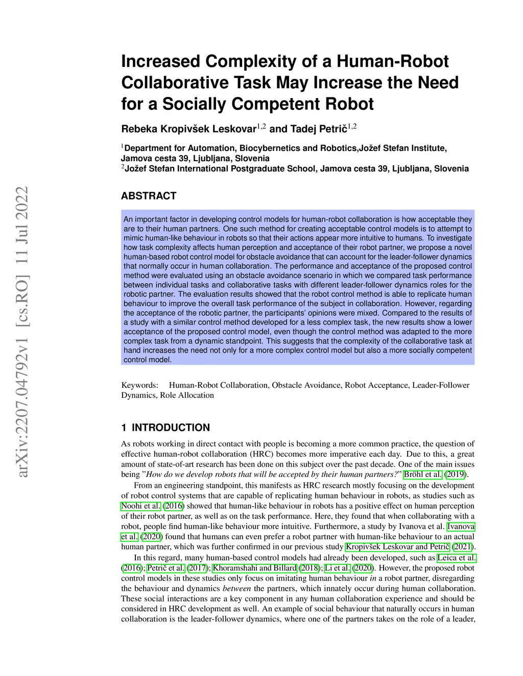 An important factor in developing control models for human-robot collaboration is how acceptable they are to their human partners. One such method for creating acceptable control models is to attempt to mimic human-like behaviour in robots so that their actions appear more intuitive to humans. To investigate how task complexity affects human perception and acceptance of their robot partner, we propose a novel human-based robot control model for obstacle avoidance that can account for the leader-follower dynamics that normally occur in human collaboration. The performance and acceptance of the proposed control method were evaluated using an obstacle avoidance scenario in which we compared task performance between individual tasks and collaborative tasks with different leader-follower dynamics roles for the robotic partner. The evaluation results showed that the robot control method is able to replicate human behaviour to improve the overall task performance of the subject in collaboration. However, regarding the acceptance of the robotic partner, the participants' opinions were mixed. Compared to the results of a study with a similar control method developed for a less complex task, the new results show a lower acceptance of the proposed control model, even though the control method was adapted to the more complex task from a dynamic standpoint. This suggests that the complexity of the collaborative task at hand increases the need not only for a more complex control model but also a more socially competent control model.
