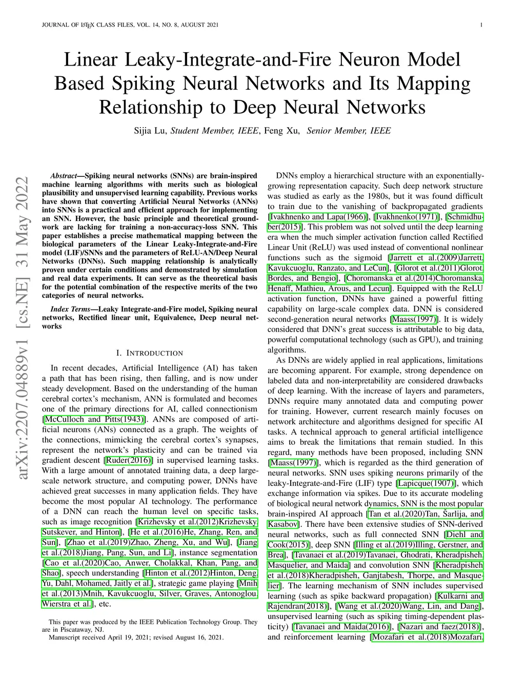 Spiking neural networks (SNNs) are brain-inspired machine learning algorithms with merits such as biological plausibility and unsupervised learning capability. Previous works have shown that converting Artificial Neural Networks (ANNs) into SNNs is a practical and efficient approach for implementing an SNN. However, the basic principle and theoretical groundwork are lacking for training a non-accuracy-loss SNN. This paper establishes a precise mathematical mapping between the biological parameters of the Linear Leaky-Integrate-and-Fire model (LIF)/SNNs and the parameters of ReLU-AN/Deep Neural Networks (DNNs). Such mapping relationship is analytically proven under certain conditions and demonstrated by simulation and real data experiments. It can serve as the theoretical basis for the potential combination of the respective merits of the two categories of neural networks.