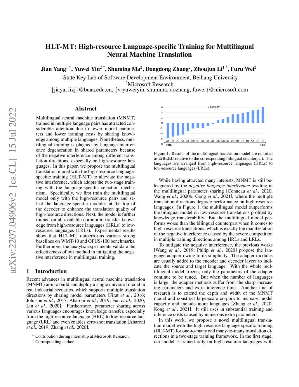 HLT-MT: High-resource Language-specific Training for Multilingual Neural