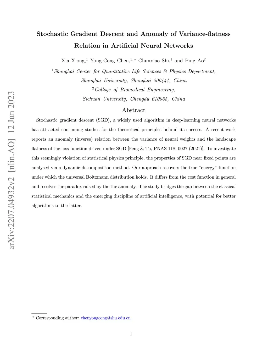 Stochastic gradient descent (SGD), a widely used algorithm in deep-learning neural networks has attracted continuing studies for the theoretical principles behind its success. A recent work reports an anomaly (inverse) relation between the variance of neural weights and the landscape flatness of the loss function driven under SGD [Feng & Tu, PNAS 118, 0027 (2021)]. To investigate this seemingly violation of statistical physics principle, the properties of SGD near fixed points are analysed via a dynamic decomposition method. Our approach recovers the true "energy" function under which the universal Boltzmann distribution holds. It differs from the cost function in general and resolves the paradox raised by the the anomaly. The study bridges the gap between the classical statistical mechanics and the emerging discipline of artificial intelligence, with potential for better algorithms to the latter.
