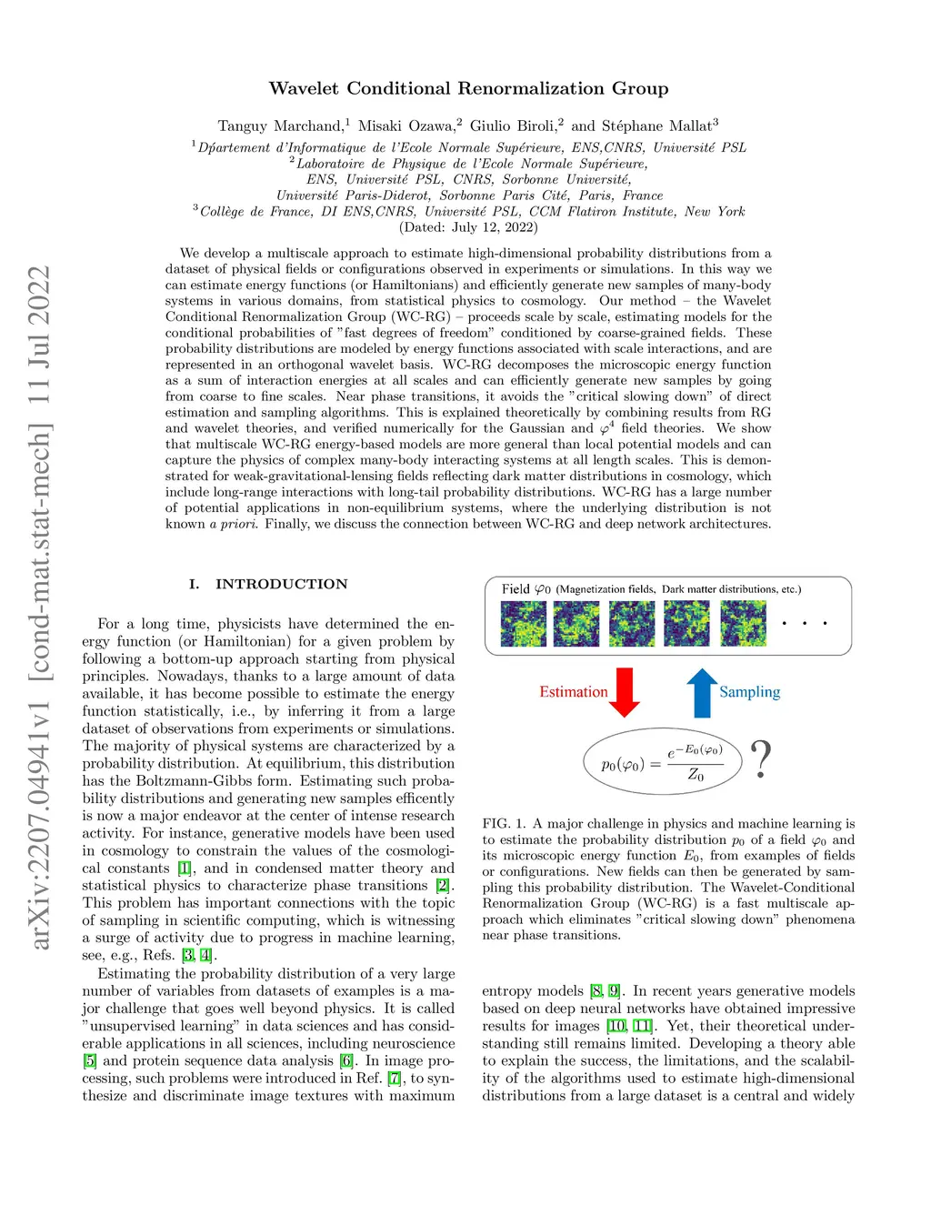 We develop a multiscale approach to estimate high-dimensional probability distributions from a dataset of physical fields or configurations observed in experiments or simulations. In this way we can estimate energy functions (or Hamiltonians) and efficiently generate new samples of many-body systems in various domains, from statistical physics to cosmology. Our method -- the Wavelet Conditional Renormalization Group (WC-RG) -- proceeds scale by scale, estimating models for the conditional probabilities of "fast degrees of freedom" conditioned by coarse-grained fields. These probability distributions are modeled by energy functions associated with scale interactions, and are represented in an orthogonal wavelet basis. WC-RG decomposes the microscopic energy function as a sum of interaction energies at all scales and can efficiently generate new samples by going from coarse to fine scales. Near phase transitions, it avoids the "critical slowing down" of direct estimation and sampling algorithms. This is explained theoretically by combining results from RG and wavelet theories, and verified numerically for the Gaussian and field theories. We show that multiscale WC-RG energy-based models are more general than local potential models and can capture the physics of complex many-body interacting systems at all length scales. This is demonstrated for weak-gravitational-lensing fields reflecting dark matter distributions in cosmology, which include long-range interactions with long-tail probability distributions. WC-RG has a large number of potential applications in non-equilibrium systems, where the underlying distribution is not known {\it a priori}. Finally, we discuss the connection between WC-RG and deep network architectures.