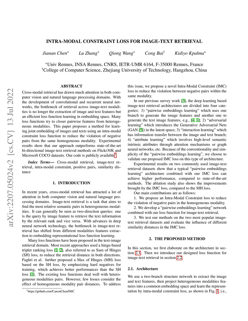 Intra-Modal Constraint Loss For Image-Text Retrieval