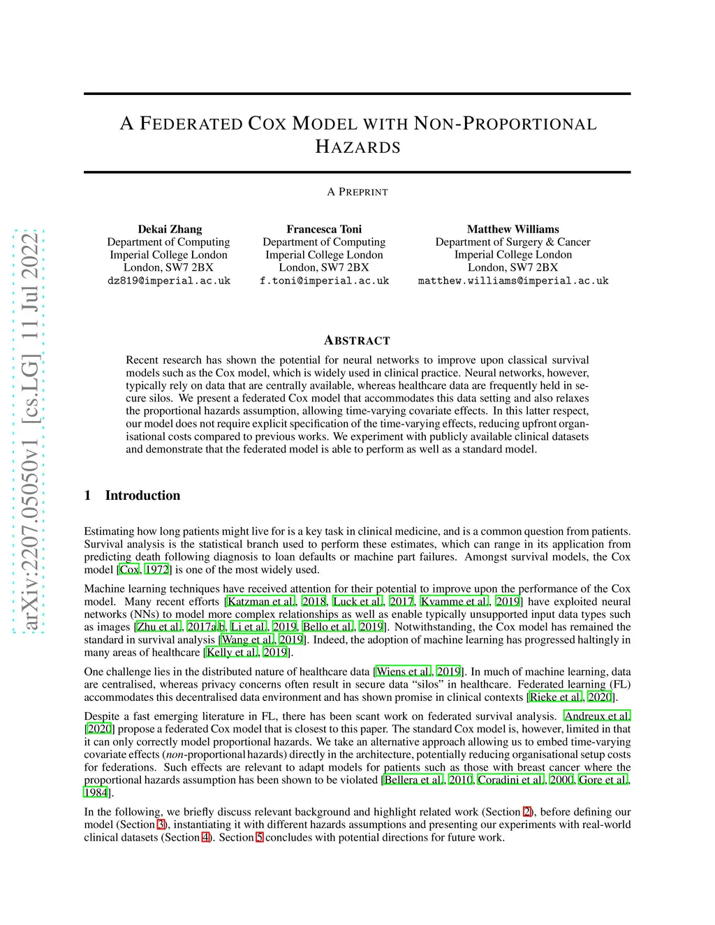 Recent research has shown the potential for neural networks to improve upon classical survival models such as the Cox model, which is widely used in clinical practice. Neural networks, however, typically rely on data that are centrally available, whereas healthcare data are frequently held in secure silos. We present a federated Cox model that accommodates this data setting and also relaxes the proportional hazards assumption, allowing time-varying covariate effects. In this latter respect, our model does not require explicit specification of the time-varying effects, reducing upfront organisational costs compared to previous works. We experiment with publicly available clinical datasets and demonstrate that the federated model is able to perform as well as a standard model.