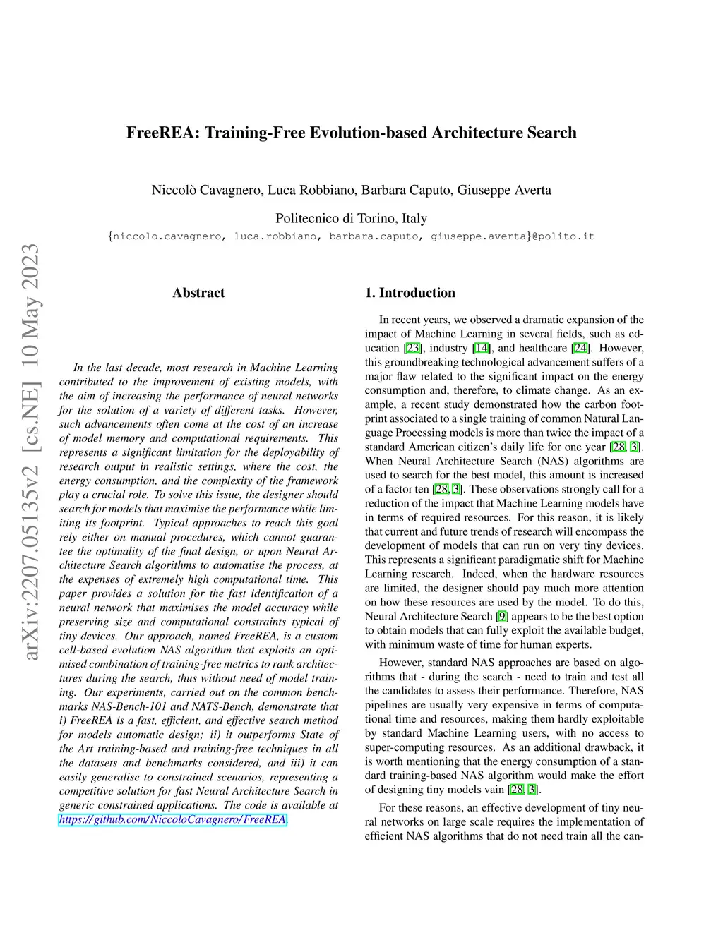 In the last decade, most research in Machine Learning contributed to the improvement of existing models, with the aim of increasing the performance of neural networks for the solution of a variety of different tasks. However, such advancements often come at the cost of an increase of model memory and computational requirements. This represents a significant limitation for the deployability of research output in realistic settings, where the cost, the energy consumption, and the complexity of the framework play a crucial role. To solve this issue, the designer should search for models that maximise the performance while limiting its footprint. Typical approaches to reach this goal rely either on manual procedures, which cannot guarantee the optimality of the final design, or upon Neural Architecture Search algorithms to automatise the process, at the expenses of extremely high computational time. This paper provides a solution for the fast identification of a neural network that maximises the model accuracy while preserving size and computational constraints typical of tiny devices. Our approach, named FreeREA, is a custom cell-based evolution NAS algorithm that exploits an optimised combination of training-free metrics to rank architectures during the search, thus without need of model training. Our experiments, carried out on the common benchmarks NAS-Bench-101 and NATS-Bench, demonstrate that i) FreeREA is a fast, efficient, and effective search method for models automatic design; ii) it outperforms State of the Art training-based and training-free techniques in all the datasets and benchmarks considered, and iii) it can easily generalise to constrained scenarios, representing a competitive solution for fast Neural Architecture Search in generic constrained applications. The code is available at \url{https://github.com/NiccoloCavagnero/FreeREA}.