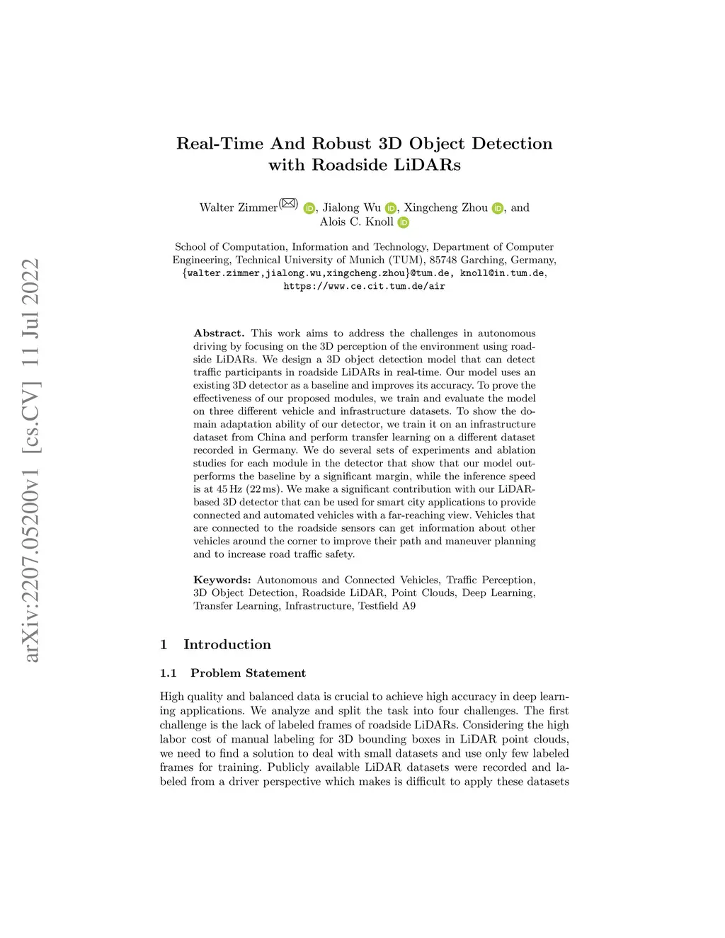 This work aims to address the challenges in autonomous driving by focusing on the 3D perception of the environment using roadside LiDARs. We design a 3D object detection model that can detect traffic participants in roadside LiDARs in real-time. Our model uses an existing 3D detector as a baseline and improves its accuracy. To prove the effectiveness of our proposed modules, we train and evaluate the model on three different vehicle and infrastructure datasets. To show the domain adaptation ability of our detector, we train it on an infrastructure dataset from China and perform transfer learning on a different dataset recorded in Germany. We do several sets of experiments and ablation studies for each module in the detector that show that our model outperforms the baseline by a significant margin, while the inference speed is at 45 Hz (22 ms). We make a significant contribution with our LiDAR-based 3D detector that can be used for smart city applications to provide connected and automated vehicles with a far-reaching view. Vehicles that are connected to the roadside sensors can get information about other vehicles around the corner to improve their path and maneuver planning and to increase road traffic safety.