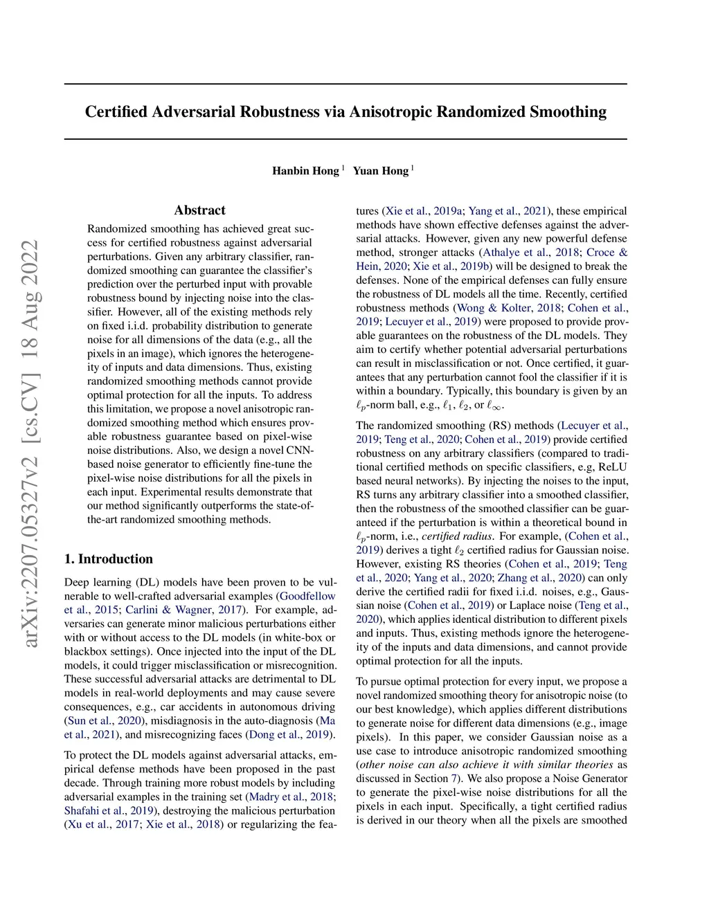 Randomized smoothing has achieved great success for certified robustness against adversarial perturbations. Given any arbitrary classifier, randomized smoothing can guarantee the classifier's prediction over the perturbed input with provable robustness bound by injecting noise into the classifier. However, all of the existing methods rely on fixed i.i.d. probability distribution to generate noise for all dimensions of the data (e.g., all the pixels in an image), which ignores the heterogeneity of inputs and data dimensions. Thus, existing randomized smoothing methods cannot provide optimal protection for all the inputs. To address this limitation, we propose a novel anisotropic randomized smoothing method which ensures provable robustness guarantee based on pixel-wise noise distributions. Also, we design a novel CNN-based noise generator to efficiently fine-tune the pixel-wise noise distributions for all the pixels in each input. Experimental results demonstrate that our method significantly outperforms the state-of-the-art randomized smoothing methods.