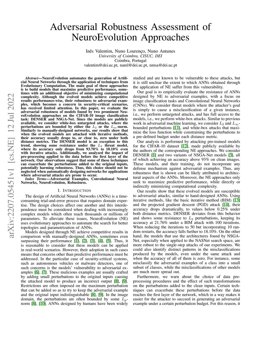 NeuroEvolution automates the generation of Artificial Neural Networks through the application of techniques from Evolutionary Computation. The main goal of these approaches is to build models that maximize predictive performance, sometimes with an additional objective of minimizing computational complexity. Although the evolved models achieve competitive results performance-wise, their robustness to adversarial examples, which becomes a concern in security-critical scenarios, has received limited attention. In this paper, we evaluate the adversarial robustness of models found by two prominent NeuroEvolution approaches on the CIFAR-10 image classification task: DENSER and NSGA-Net. Since the models are publicly available, we consider white-box untargeted attacks, where the perturbations are bounded by either the L2 or the Linfinity-norm. Similarly to manually-designed networks, our results show that when the evolved models are attacked with iterative methods, their accuracy usually drops to, or close to, zero under both distance metrics. The DENSER model is an exception to this trend, showing some resistance under the L2 threat model, where its accuracy only drops from 93.70% to 18.10% even with iterative attacks. Additionally, we analyzed the impact of pre-processing applied to the data before the first layer of the network. Our observations suggest that some of these techniques can exacerbate the perturbations added to the original inputs, potentially harming robustness. Thus, this choice should not be neglected when automatically designing networks for applications where adversarial attacks are prone to occur.